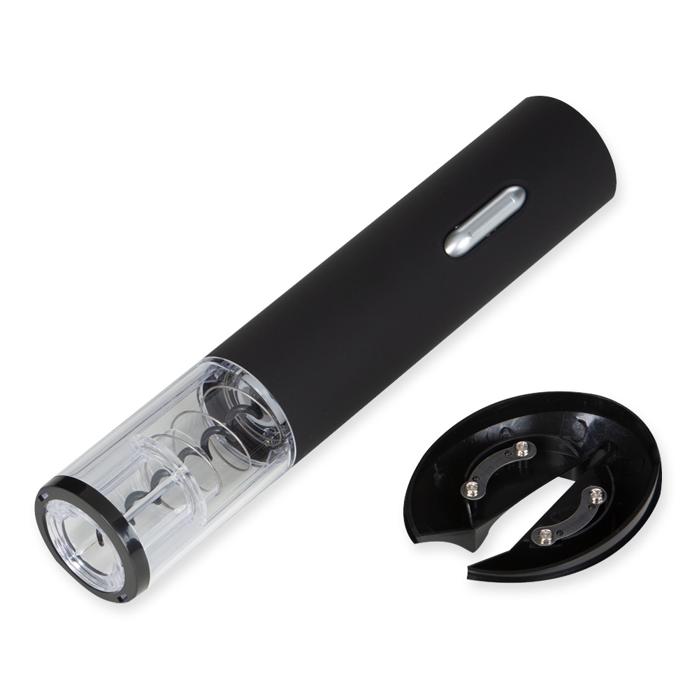 Saca-rolhas elétrico com suporte cortador de lacre, contém compartimento com tampa para inclusão de 4 pilhas AA (não acompanha). O suporte cortador de lacre também pode ser utilizado como base de sustentação. Altura :  23,4 cm Largura :  4,8 cm Comprimento :  14,2 cm Medidas aproximadas para gravação (CxL):  1,5 cm x 4 cm Peso aproximado (g):  262