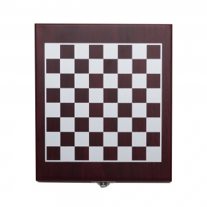 Kit vinho formato xadrez: Material em MDF vinho com desenho de tabuleiro superior. Parte frontal com trava de metal e parte traseira com dobradiças; compartimento interno revestido com espuma; possui 32 peças de xadrez sendo 16 marfim e 16 marrom. Possui abridor saca rolhas, wine collar, tampa de bico e termômetro.