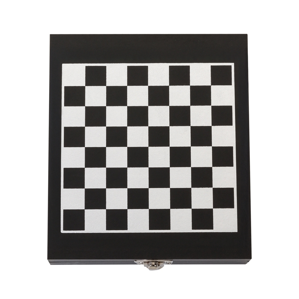 Kit vinho 4 peças em estojo tabuleiro de xadrez. Contém wine collar, tampa de bico, bico condutor com tampa e saca-rolhas metálico com lâmina de corte e abridor de garrafa. Estojo com trava de segurança e área interna com berço de espuma, acompanham 32 peças de xadrez e plaquinha metálica para personalização.