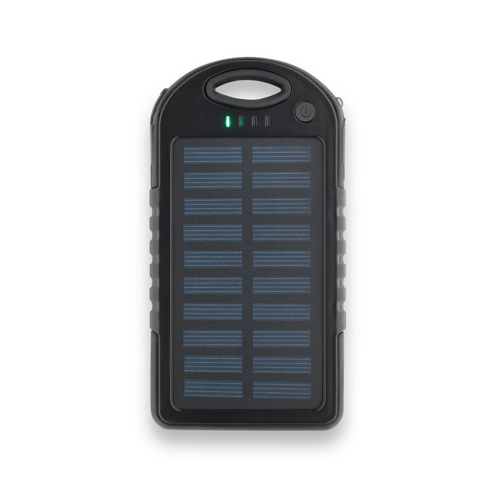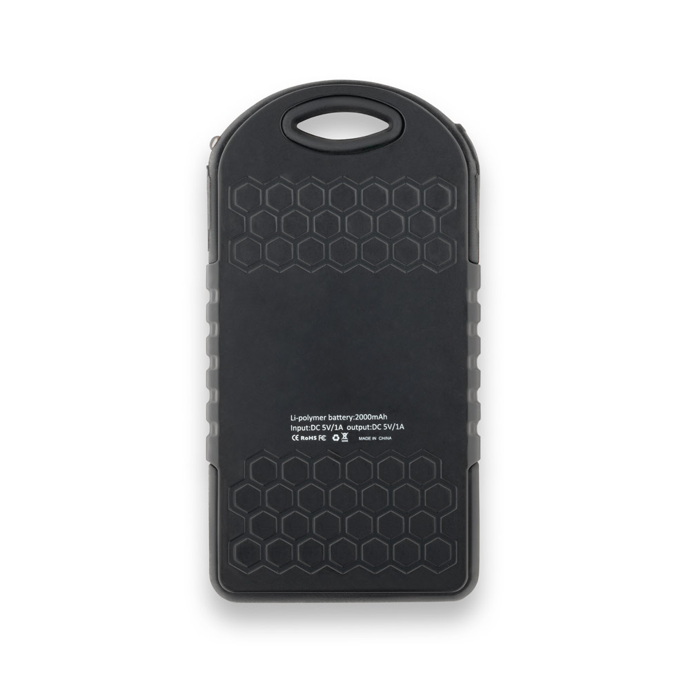 Bateria portátil solar em ABS com painel solar e LED. Bateria de lítio com capacidade de 2’000 mAh, uma porta de entrada USB-C e duas portas de saída USB-A. Incluso cabo USB-C para carregar a bateria. Fornecida em caixa presente. 143 x 77 x 16 mm | Caixa: 165 x 80 x 20 mm