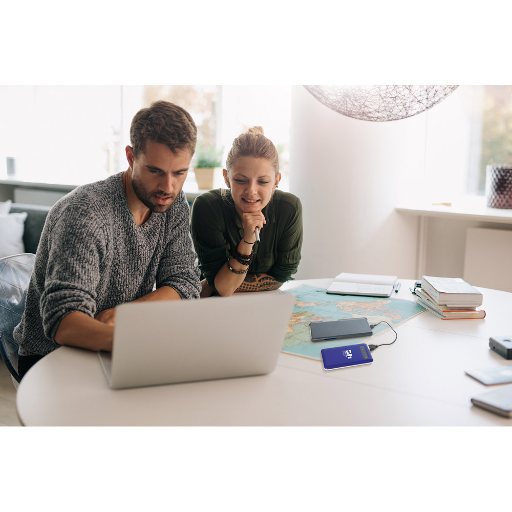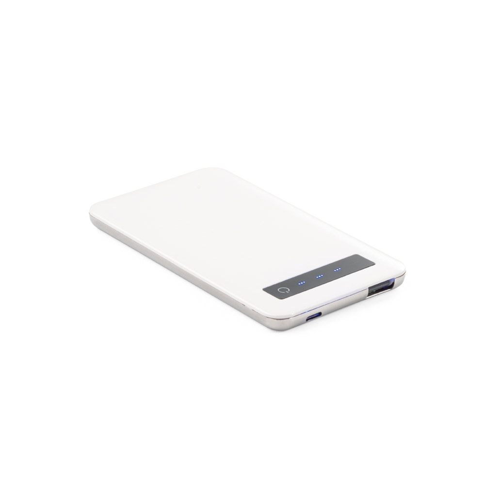 Bateria portátil slim em ABS e aço inox, com tela touch e indicador de carga. Bateria polímero de lítio com capacidade de 4’000 mAh e tempo de vida ≥ 500 ciclos, com porta de entrada micro USB e porta de saída USB-A. Incluso cabo USB-A / micro USB para carregar a bateria. Fornecido em caixa presente. 116 x 65 x 7 mm