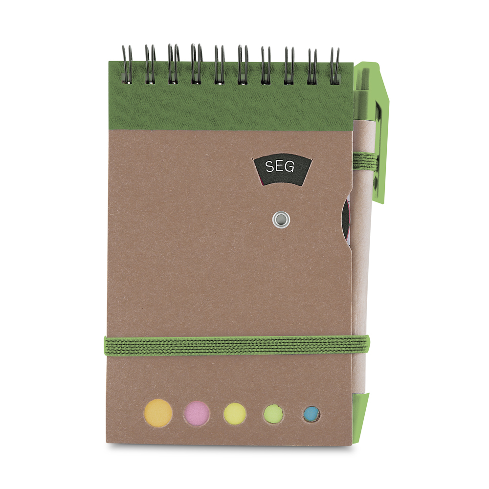 Mini Caderno com capa em papel kraft, com 70 folhas pautadas e blocos adesivos (sticky notes) coloridos. Acompanha disco rotativo na capa com os dias da semana e caneta produzida em papelão reciclado com detalhes em plástico e escrita em azul.