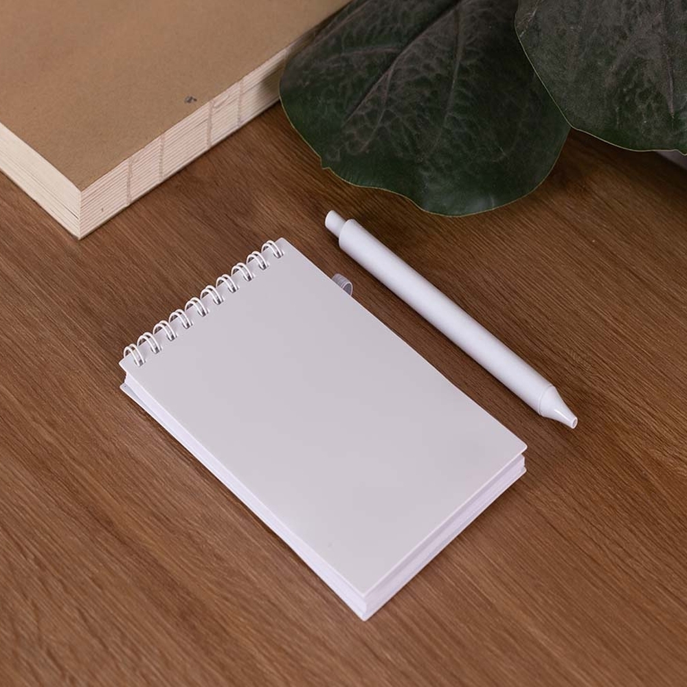 Bloco de anotações antibacteriano com caneta plástica: Bloco de anotações com elástico e suporte para caneta, aproximadamente 60 folhas brancas sem pauta, caneta plástica com acionamento por clique.