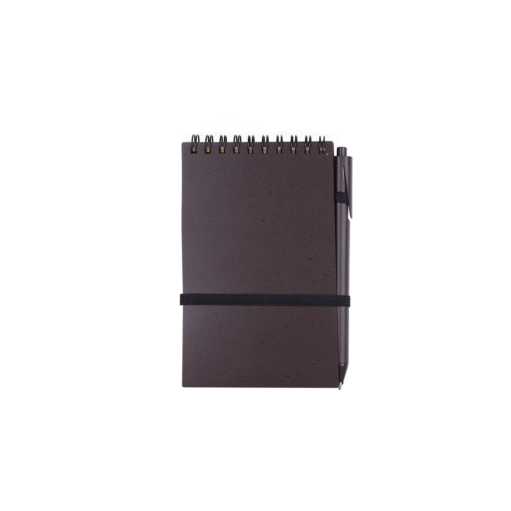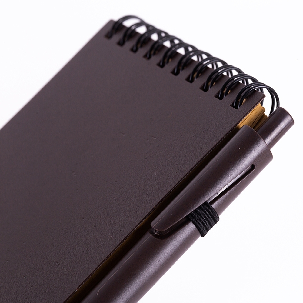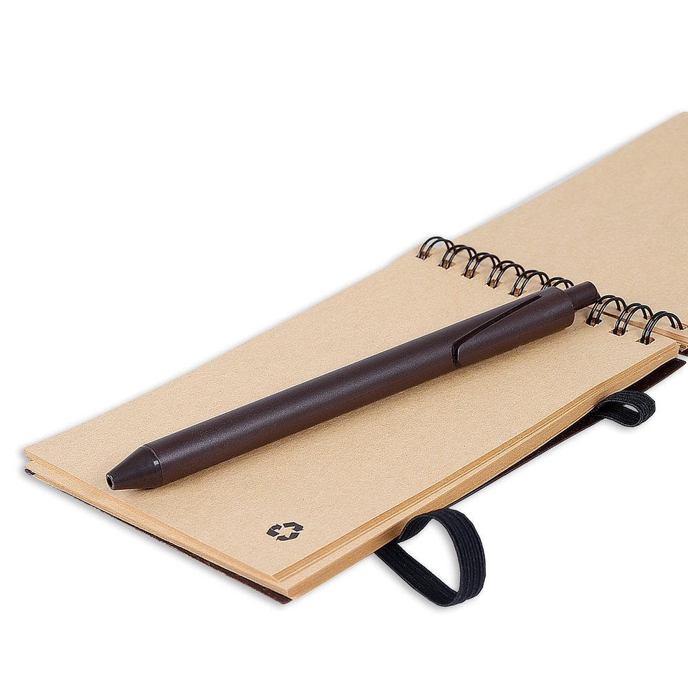 Bloco de anotações ecológico com caneta plástica: Bloco de anotações com elástico e suporte para caneta, produzido com grãos de café e polipropileno, aproximadamente 60 folhas marrons sem pauta, caneta plástica com acionamento por clique.
