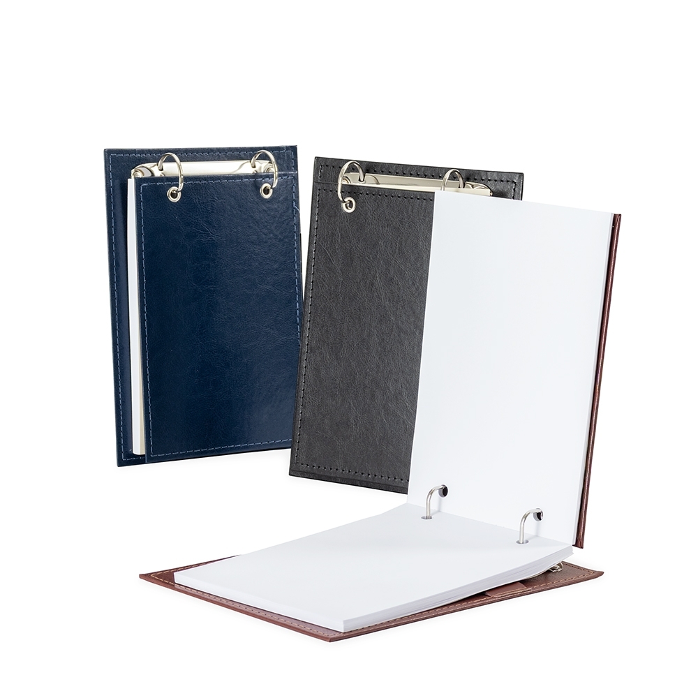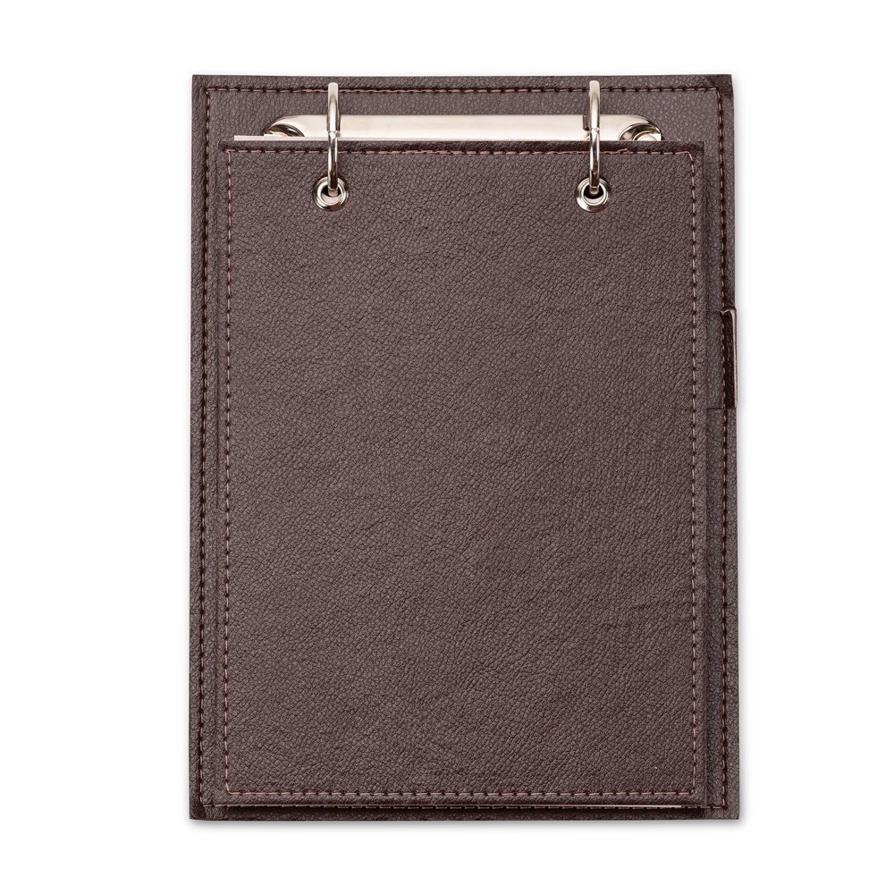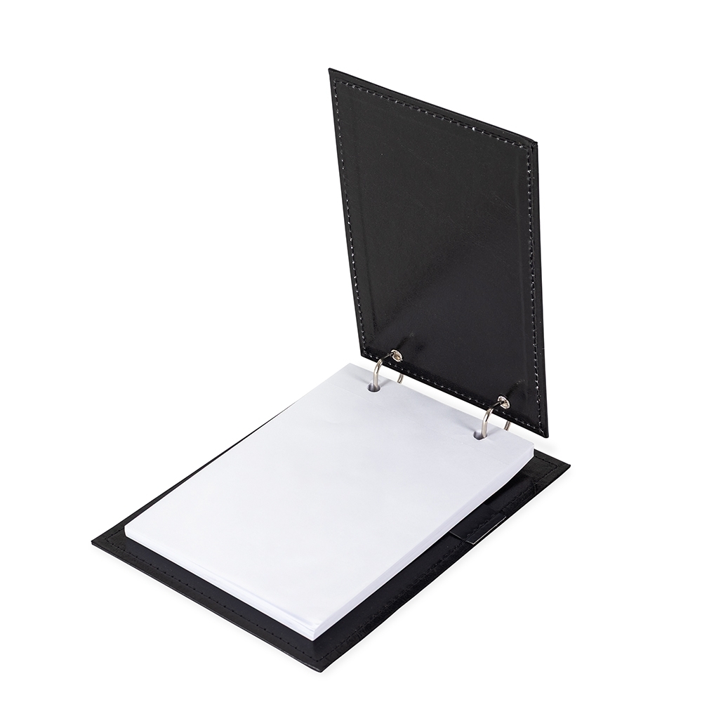 Bloco de anotações de mesa com trilho de ferro, capa em couro sintético. Possui suporte na lateral interna para colocar caneta (não acompanha) e aproximadamente 96 folhas com área destacável.