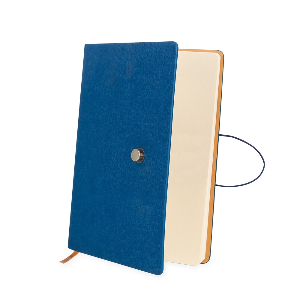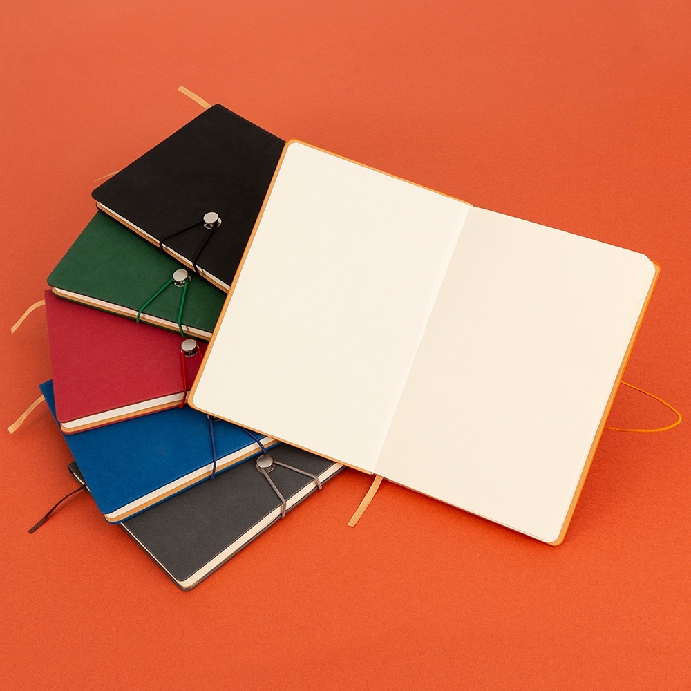 Caderneta com fecho de pino e elástico de nylon para lacre. Capa em material sintético emborrachado, possui aproximadamente 96 folhas pardas pautadas e marca página em cetim.