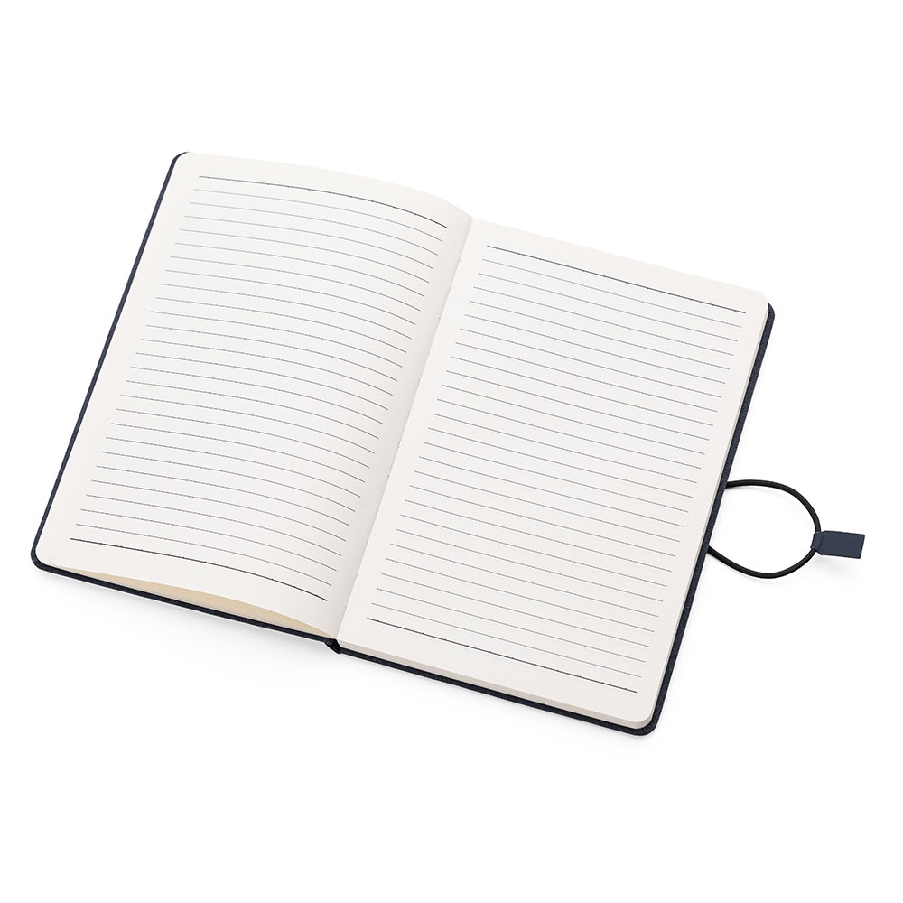 Caderneta capa dura em tecido de poliéster. Miolo com 80 folhas pautadas na cor bege. Possui elástico lateral com detalhe em couro sintético para fechamento do caderno.