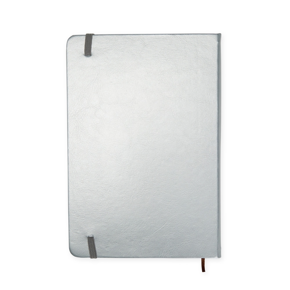 Caderneta de couro sintético, marcador de página em cetim e fita elástica para fechar. Contém aproximadamente 78 folhas amareladas sem pauta.