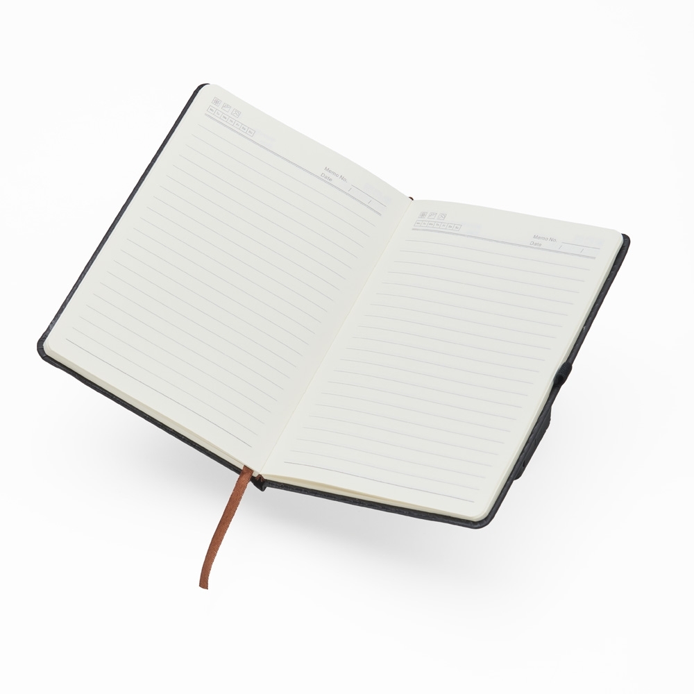 Caderneta emborrachada com suporte para caneta. Contém aproximadamente 96 folhas amarelas com pauta, suporte de nylon para caneta (não acompanha), marcador de página em cetim e elástico para lacre com plaquinha de centro emborrachado.