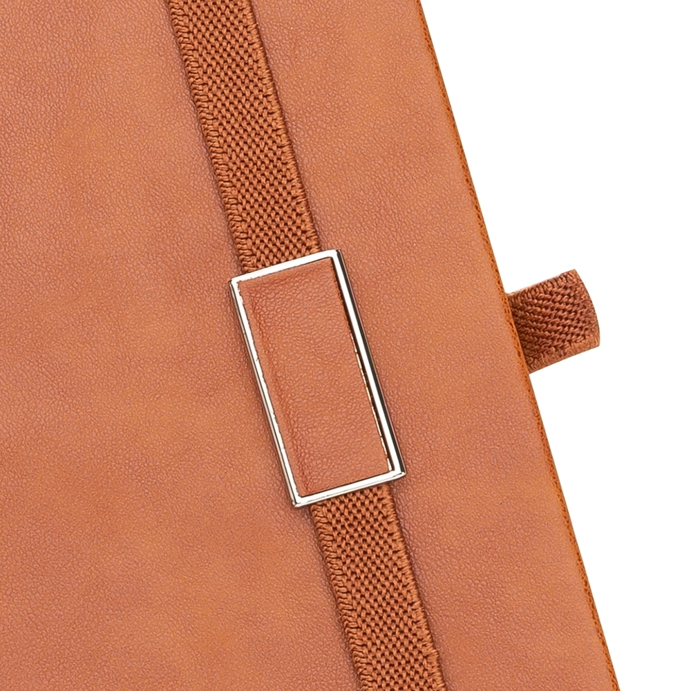 Caderneta emborrachada com suporte para caneta. Contém aproximadamente 96 folhas amarelas sem pauta, suporte de nylon para caneta (não acompanha), marcador de página em cetim e elástico para lacre com plaquinha de centro emborrachado.