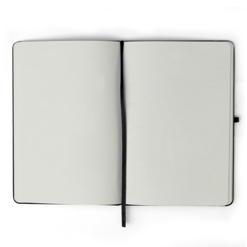 Caderneta emborrachada com porta caneta elástico em nylon, marcador de página em cetim e fita elástica de nylon para fechar. Contém aproximadamente 80 folhas pardas sem pauta.