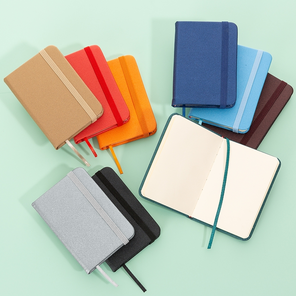 Mini Caderneta em material sintético brilhante com marcador de página em cetim e fita elástica para fechar. Contém aproximadamente 80 folhas amareladas sem pauta.