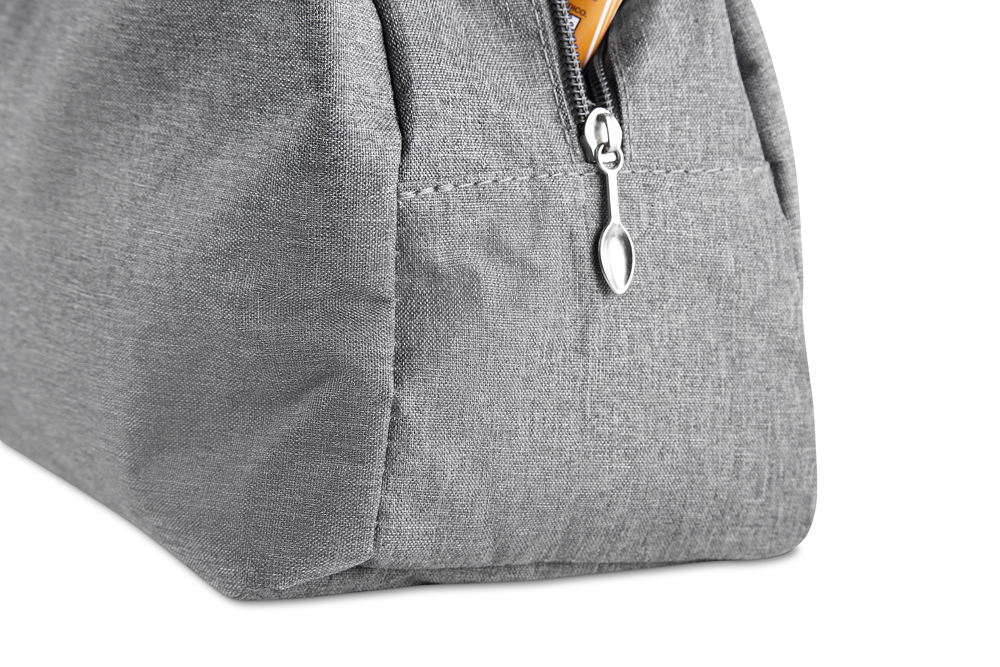 Bolsa térmica costurada, produzida em poliéster 300D na parte externa e alumínio com manta térmica no interior. Modelo sem solda, puxador de zíper em formato de colher, com capacidade para 7 litros.