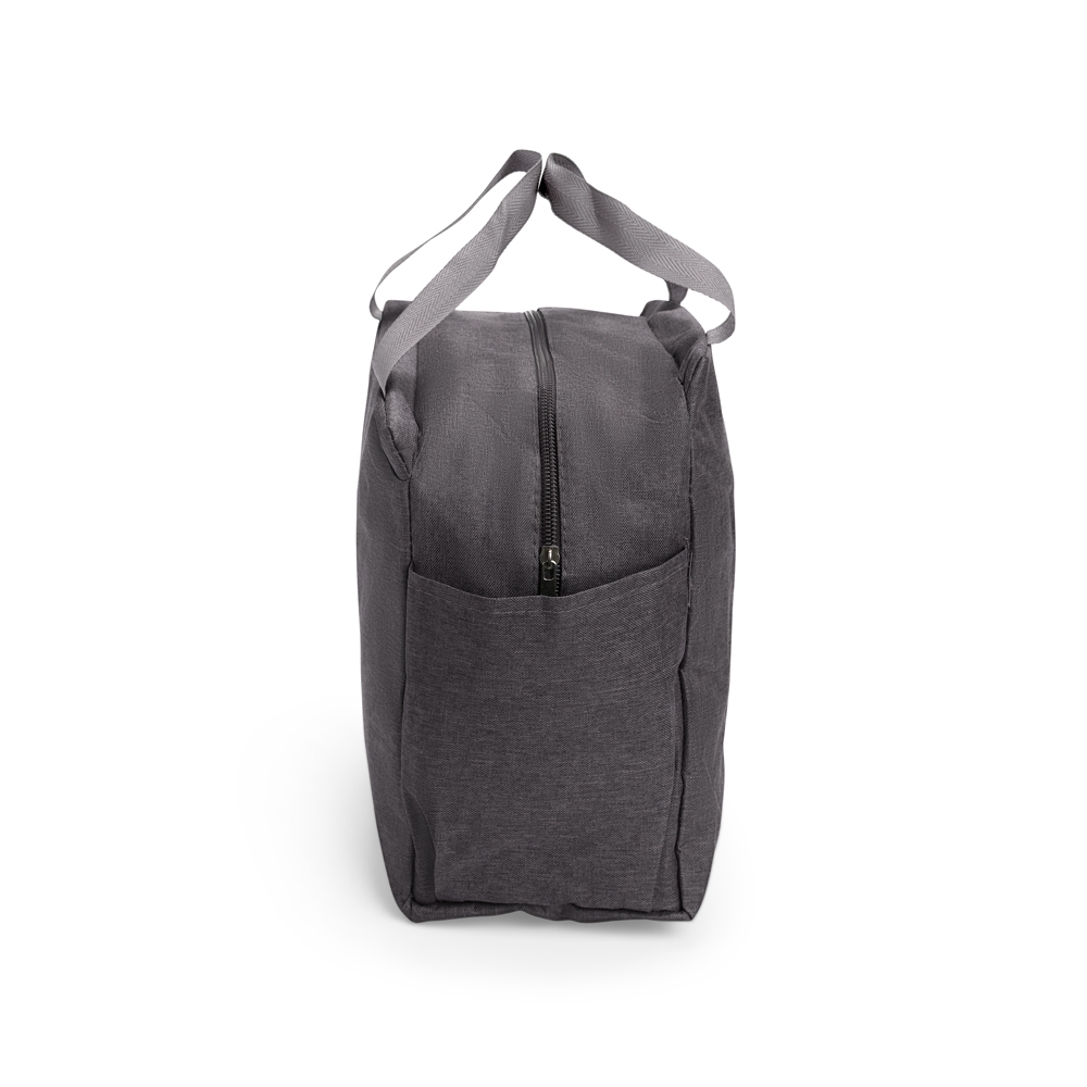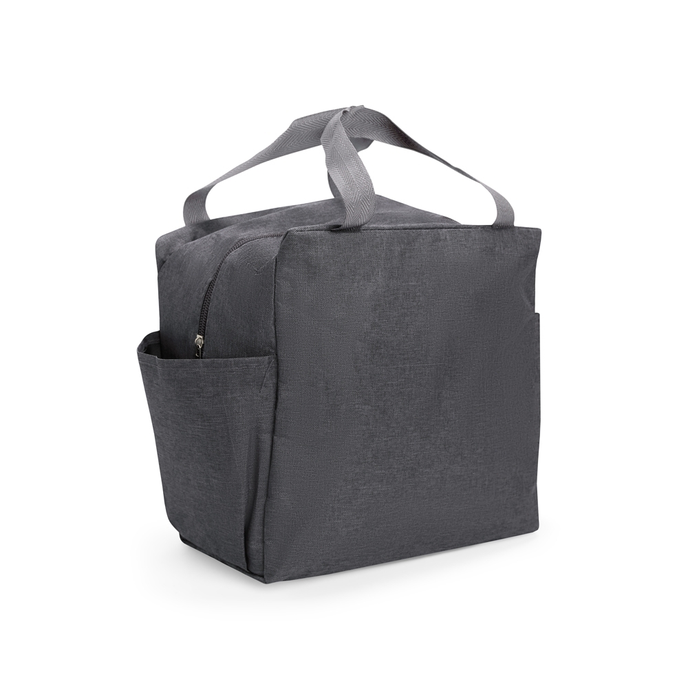 Bolsa térmica confeccionada em Oxford resistente à água, fechamento em zíper e capacidade de até 12 litros. Possui revestimento térmico em folha de alumínio, além de dois bolsos laterais e um par de alças em nylon para transporte.