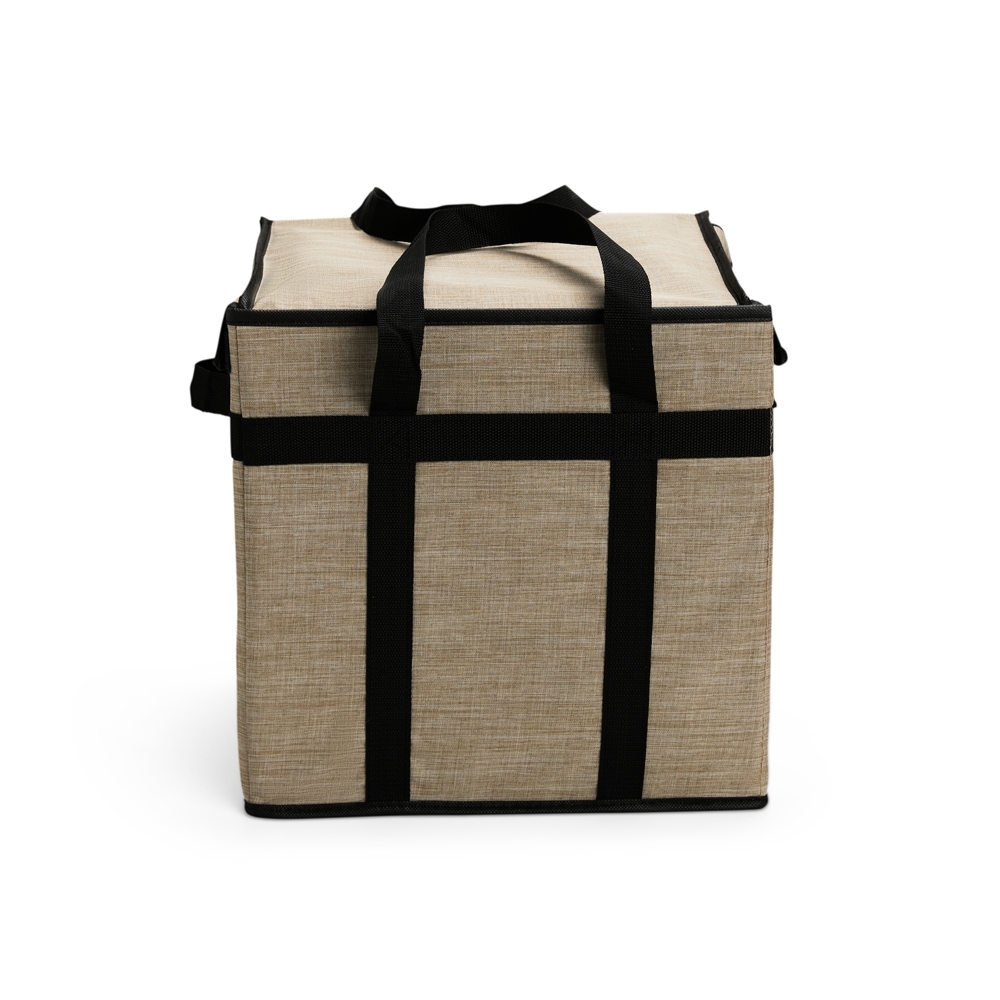 Bolsa térmica confeccionada em Oxford impermeável, fechamento em velcro e capacidade máxima de 35 litros. Conta com armação interna em placa de PVC e junção inferior em velcro, que facilita o transporte quando a bolsa não estiver em uso. Possui revestimento térmico interno em folha de alumínio e um par de alças de nylon para transporte.