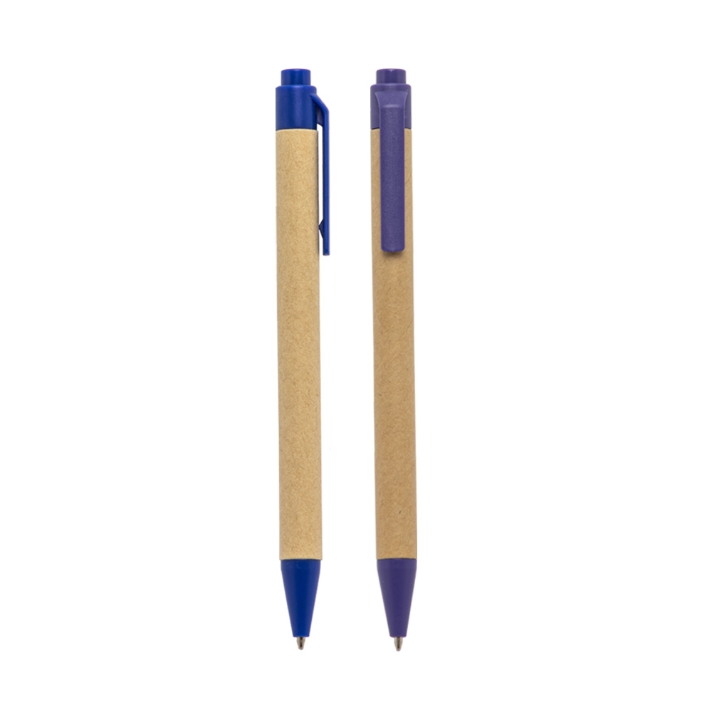 Caneta de papelão com detalhes plásticos, carga esferográfica azul e acionamento por clique.
