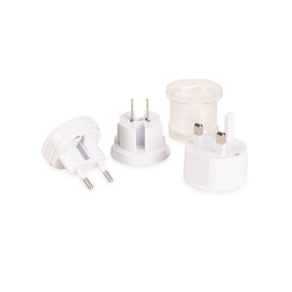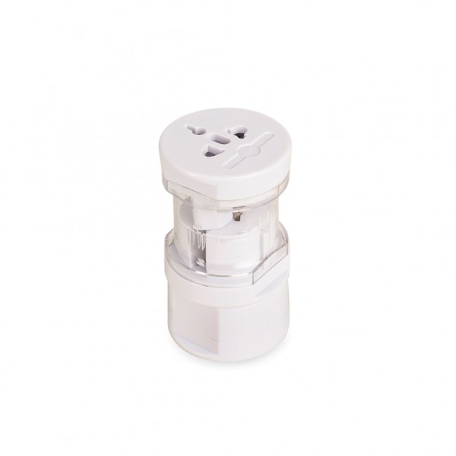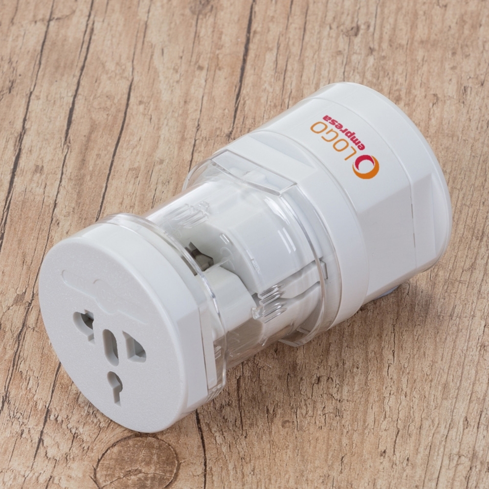 [vc_row][vc_column width=”2/3″]n[vc_column_text]Adaptador universal branco em plástico resistente com detalhe acrílico. Possui plug EU(EUROPA), Plug UK(INGLATERRA) e Plug USA/AU(ESTADOS UNIDOS/AUSTRÁLIA). Acompanha saquinho tnt para transporte do adaptador. Obs.: Este adaptador não converte voltagem, não utilizar com secador de cabelo, e quando não estiver sendo utilizado deverá desconectá-lo. n n n n n n Medidas aproximadas para gravação (CxL): 1,6 cm x 5 cmn Tamanho total aproximado (CxL): 8,7 cm x 4,7 cm x 15,1 cmn Peso aproximado (g): 88n