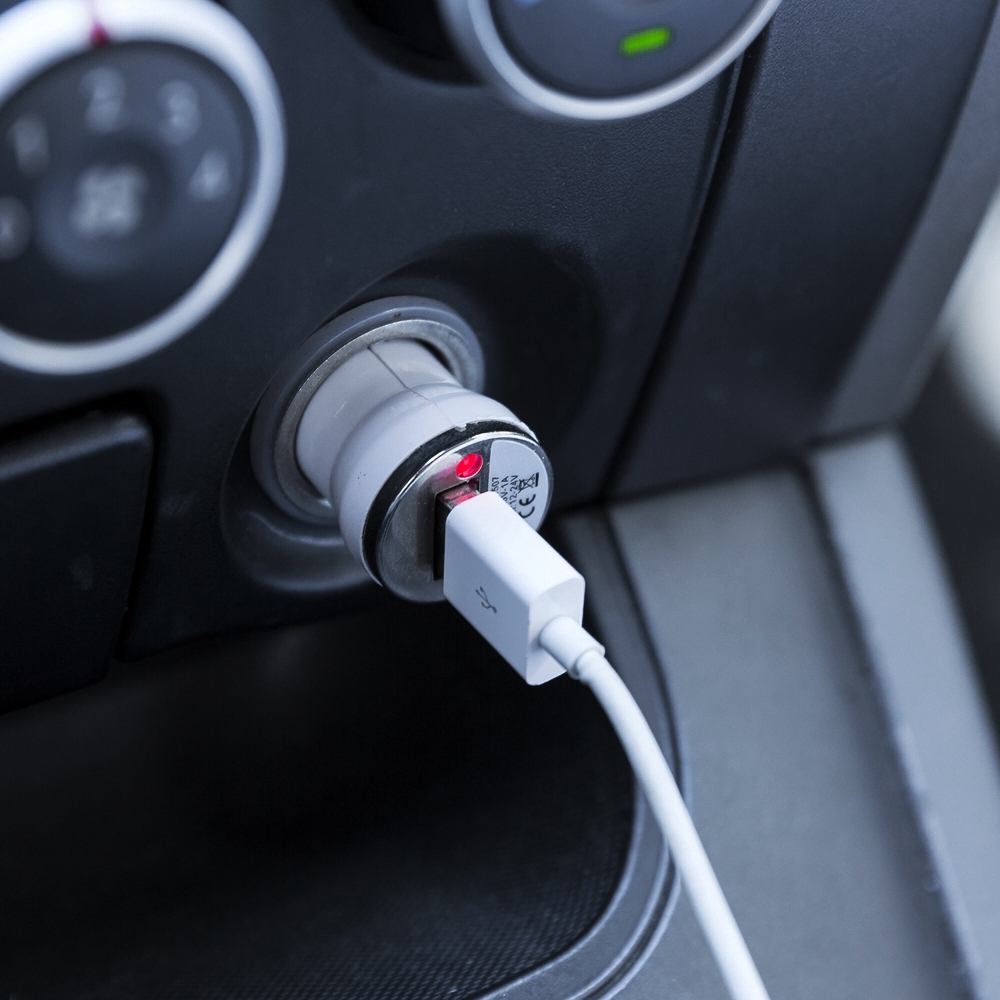 Carregador veicular USB com luz indicativa de funcionamento.