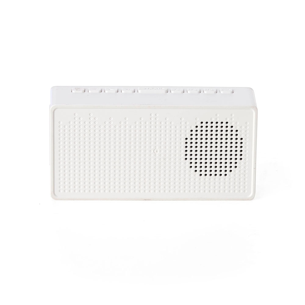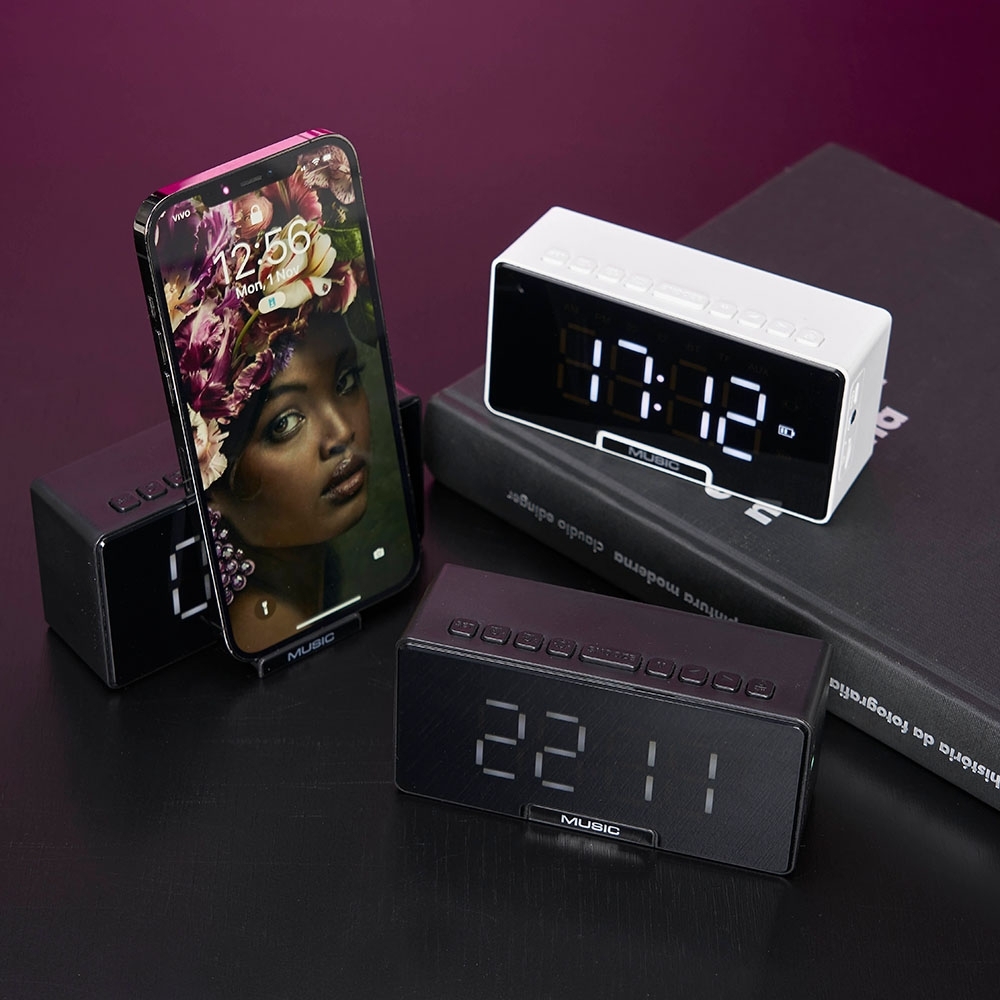 Caixa de som multimídia com relógio despertador e suporte para celular. Produzida em plástico e com borrachas antiderrapantes na área inferior, a caixa de som tem a área frontal com display de LED, além de um compartimento com suporte para celular – uma espécie de “gaveta” aonde é exibido (MUSIC), basta puxá-la ter acesso ao compartimento. A caixa de som executa nos modos bluetooth, cartão TF-microSD e entrada auxiliar P2. Acompanha cabo USB e manual em inglês.