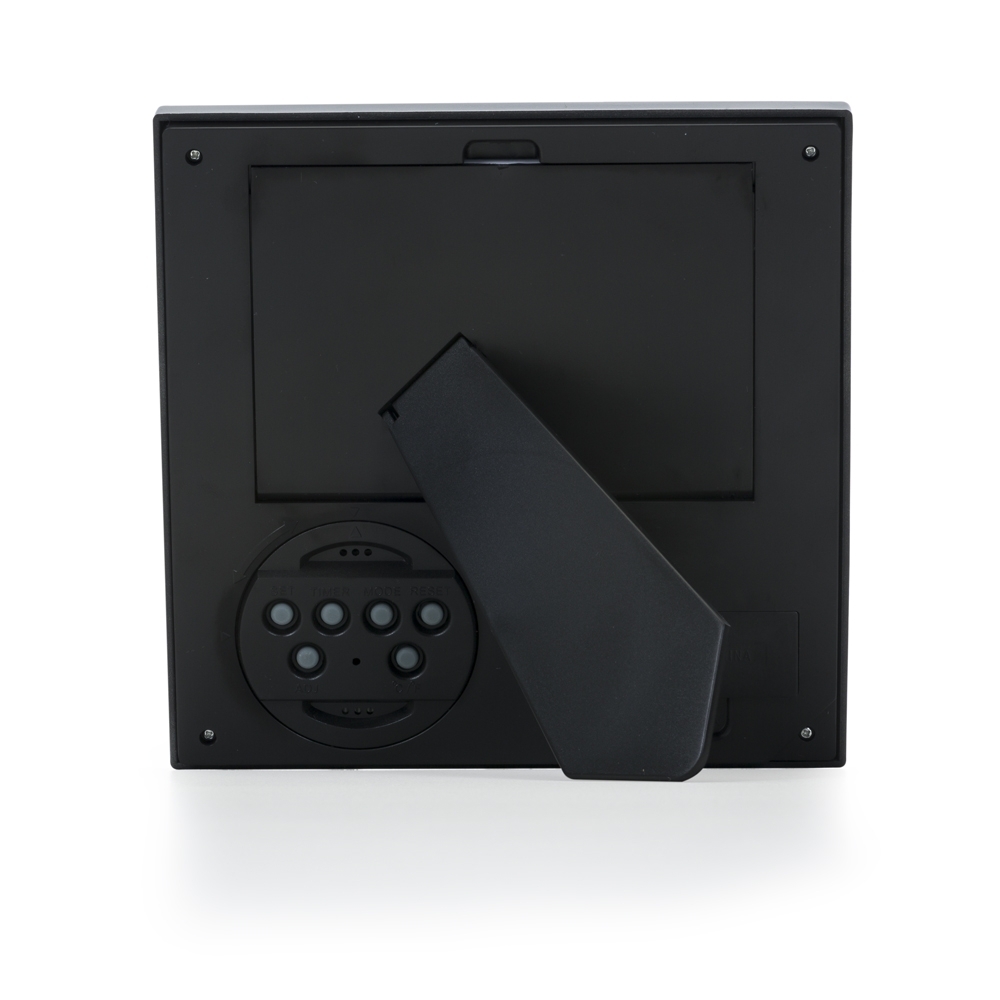 Porta retrato plástico com relógio digital: Parte traseira da peça na cor preta, compartimento com apoiador e foto basta levantá-lo para trocar, compartimento de configuração pode ser rotacionado caso queira utilizar a foto vertical/horizontal. Fucionamento – SET: ao pressioná-lo poderá fazer alterações nas horas/minutos, ano, mês e data. TIMER: ao pressioná-lo ativará função timer. MODE: ao pressioná-lo poderá fazer alterações no alarme e toque do alarme, ativa/desativa alarme. RESET: restaura configurações de fábrica. ADJ: ao pressioná-lo poderá fazer alterações no sistema de visualização de horas(24hs ou AM/PM). C(celsius)/F(fahrenheit): altera o sistema de visualização de graus(Celsius ou Fahrenheit). Utiliza 2 pilhas palito AAA(não acompanha).Código: MP-1372