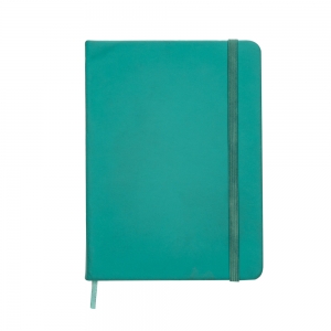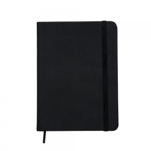 Caderneta tipo moleskine: Emborrachado de frente e verso liso, marcador de página em cetim e fita elástica para fechar. Contém aproximadamente 80 folhas amarelas pautadas.