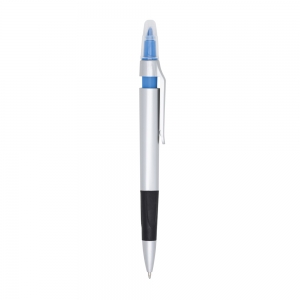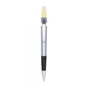 Caneta plástica esferográfica e marca texto: Com corpo prata. Possui tampa protetora no marca texto e detalhe emborrachado com relevo na parte inferior. Aciona por clique.