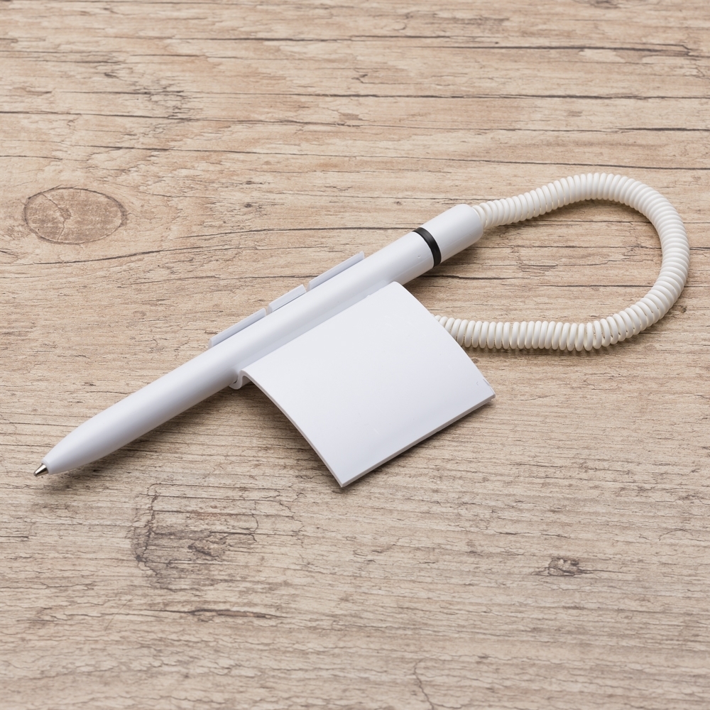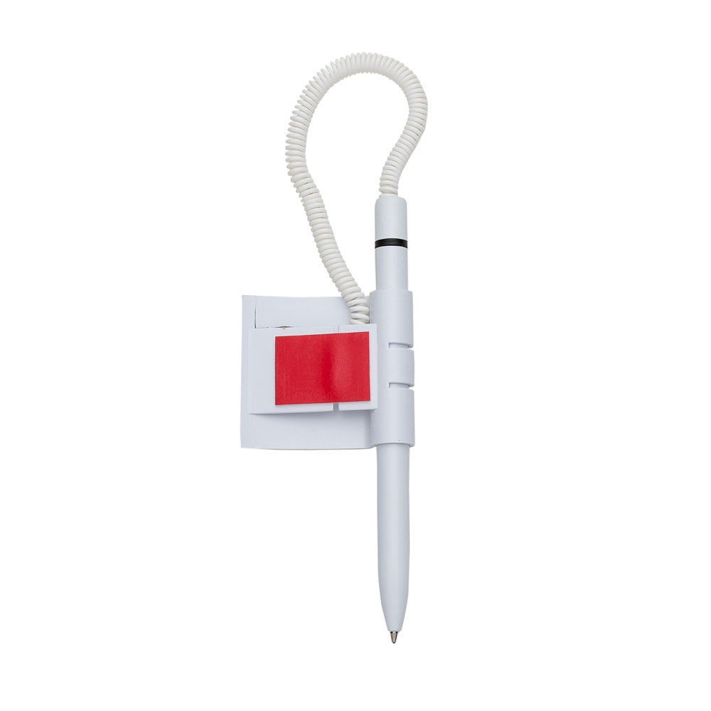 Caneta balcão plástica com suporte e adesivo auto colante. Carga esferográfica azul. QUANTIDADE MÍNIMA DE 100 PEÇAS!