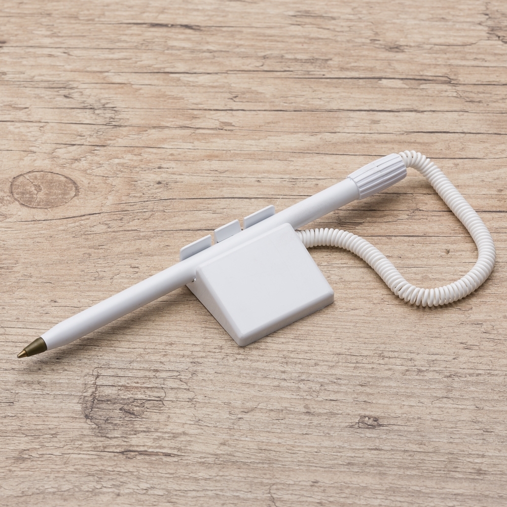 [vc_row][vc_column width=”2/3″]n[vc_column_text]Caneta balcão plástica inteira branca com detalhe colorido. Acionador com relevo, possui traseira com adesivo auto-colante. QUANTIDADE MÍNIMA DE 100 PEÇAS! n n n n n n Medidas aproximadas para gravação (CxL): 3,6 cm x 2,8 cmn Tamanho total aproximado (CxL): 17 cm x 4 cmn Peso aproximado (g): 12n