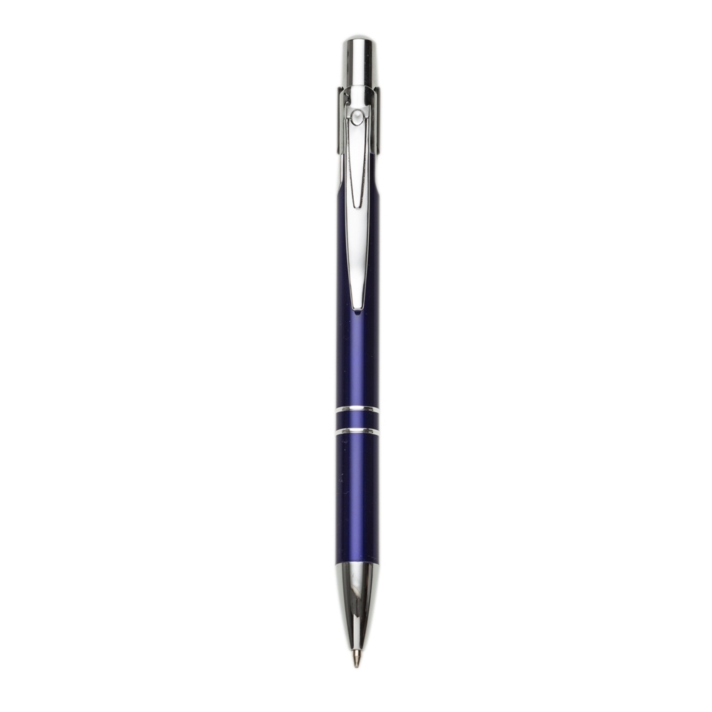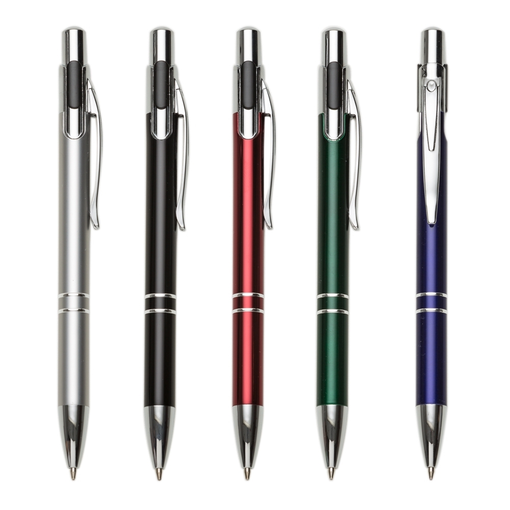 Caneta metal colorida com detalhes prata. Clip metálico prata com detalhes em relevo, tem a lateral com detalhe plástico preto. Possui dois anéis prata na parte inferior. Aciona por clique.