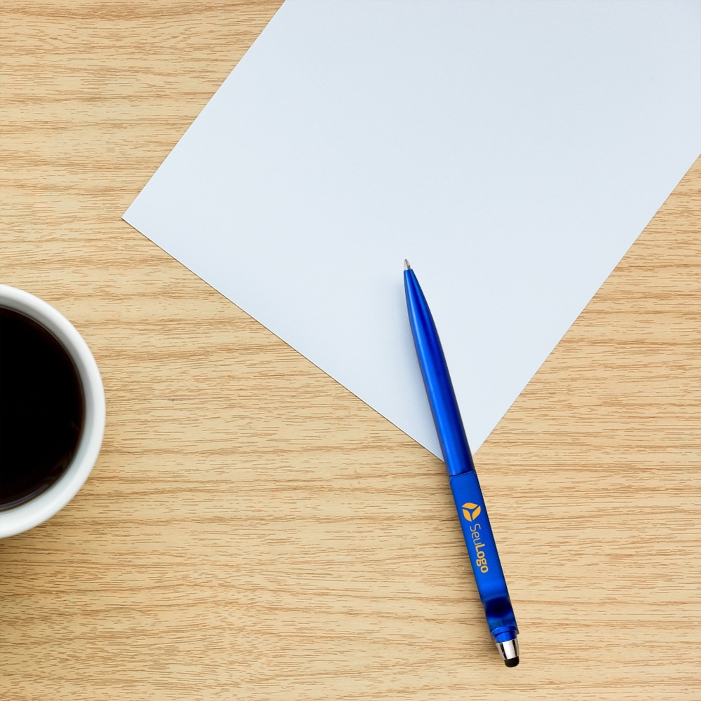 Caneta plástica com suporte para celular e touch screen. Carga esferográfica azul e acionamento por rotação. OBS.: PEDIDOS MÍNIMO DE 50 PEÇAS! Largura :  2 cm Comprimento :  15,5 cm Medidas aproximadas para gravação (CxL):  Clip 4 cm x 1 cm – 3,5 cm x 0,7 cm Peso aproximado (g):  10