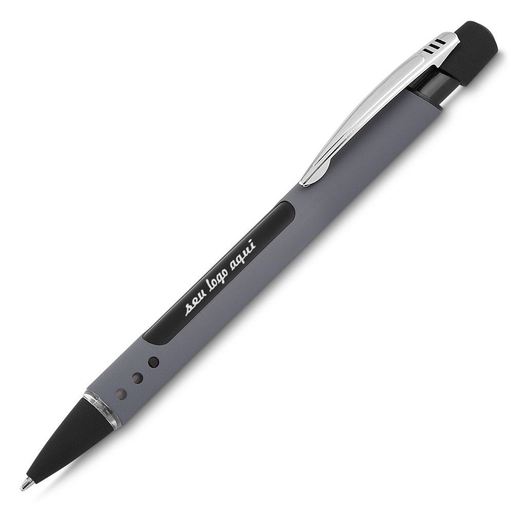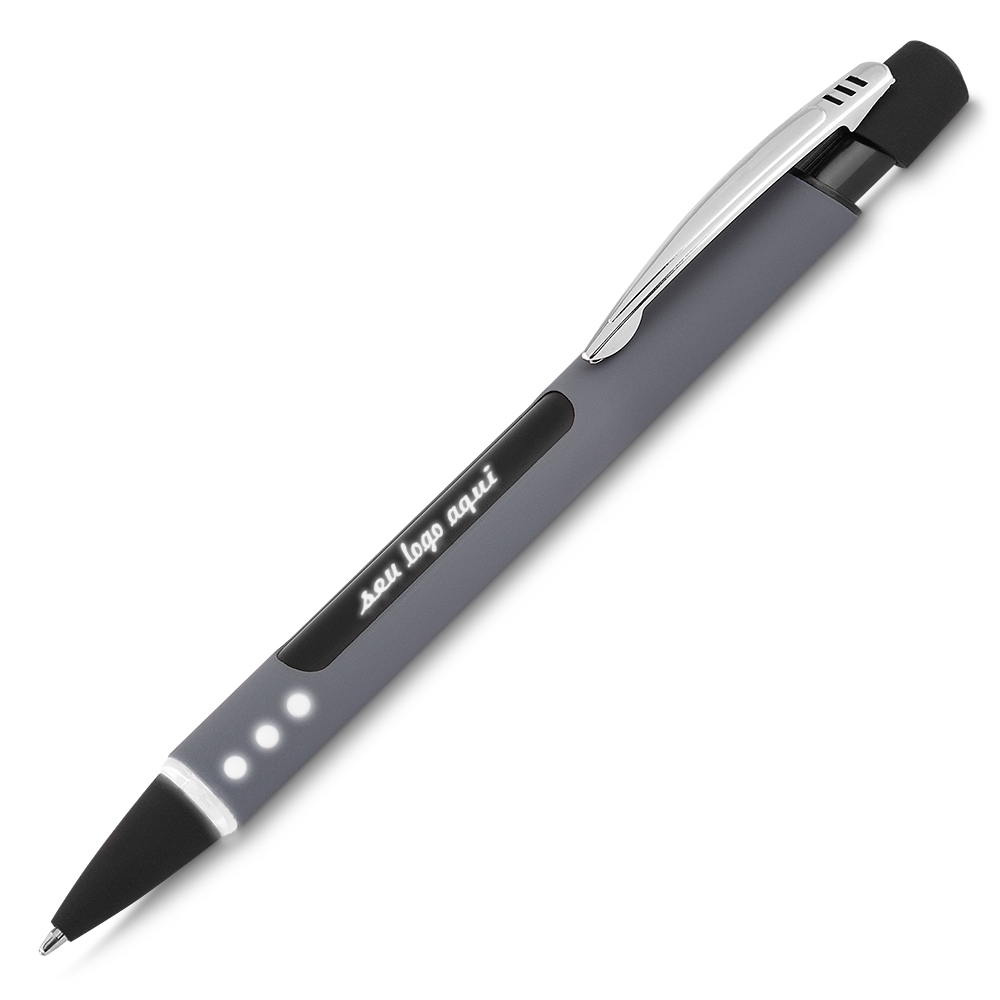 Caneta semimetal cinza com led. Com acionador emborrachado e clip metálico, possui detalhes circulares e um anel translúcido na área inferior, sendo estes iluminados quando ligado o led. Na área inferior há um retângulo preto para gravação, quando efetuado a personalização no local ela também será iluminada através do led. Esferográfica aciona por clique, led aciona mediante dois cliques.