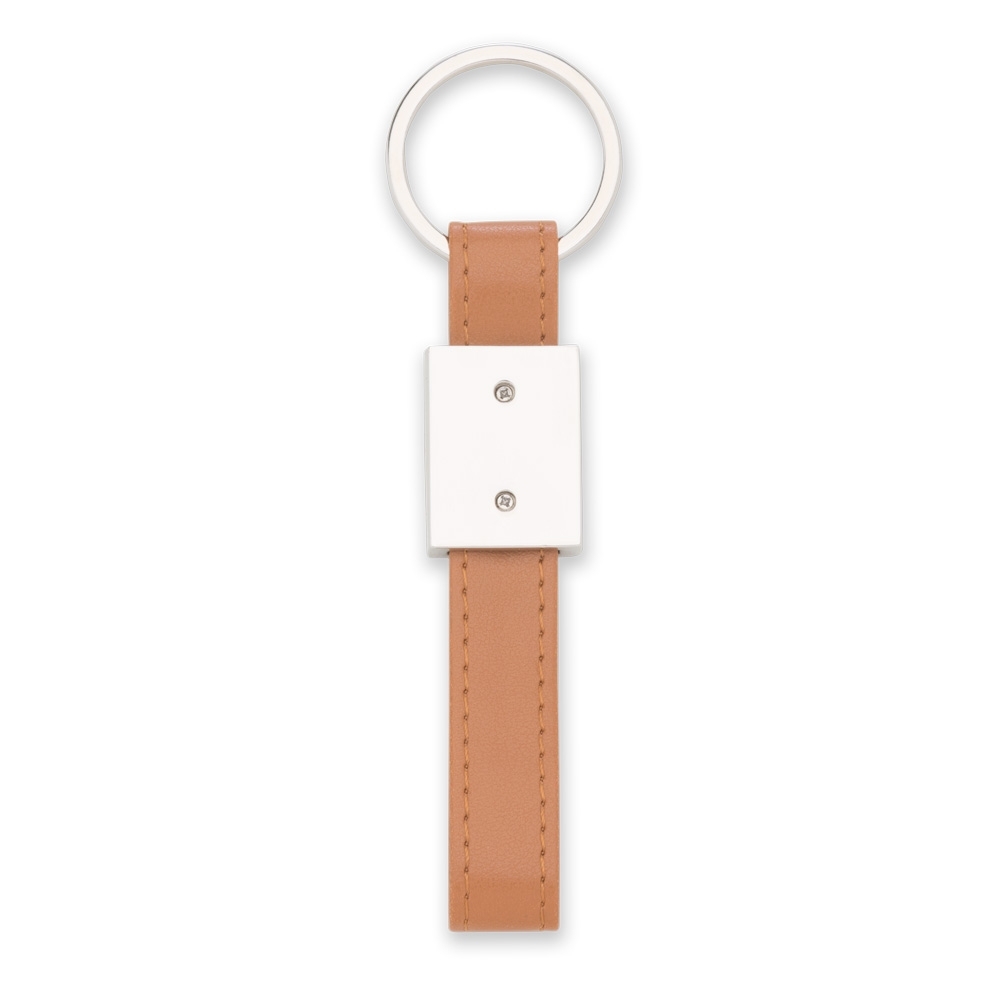 Chaveiro de metal quadrado com alça emborrachada: Detalhes na costura. Possui chapa frontal em metal e verso liso com detalhe dos parafusos.