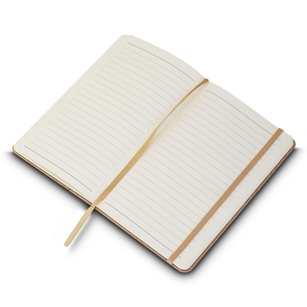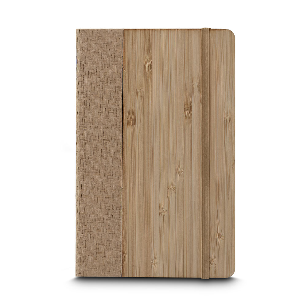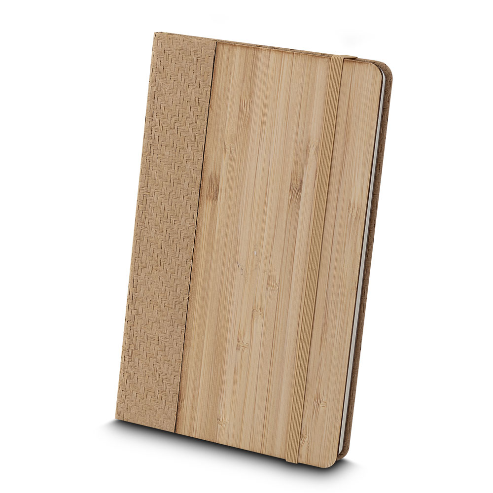 Caderno de anotações, capa em fibra de bambu com elástico e miolo com 80 folhas pautadas na cor bege.