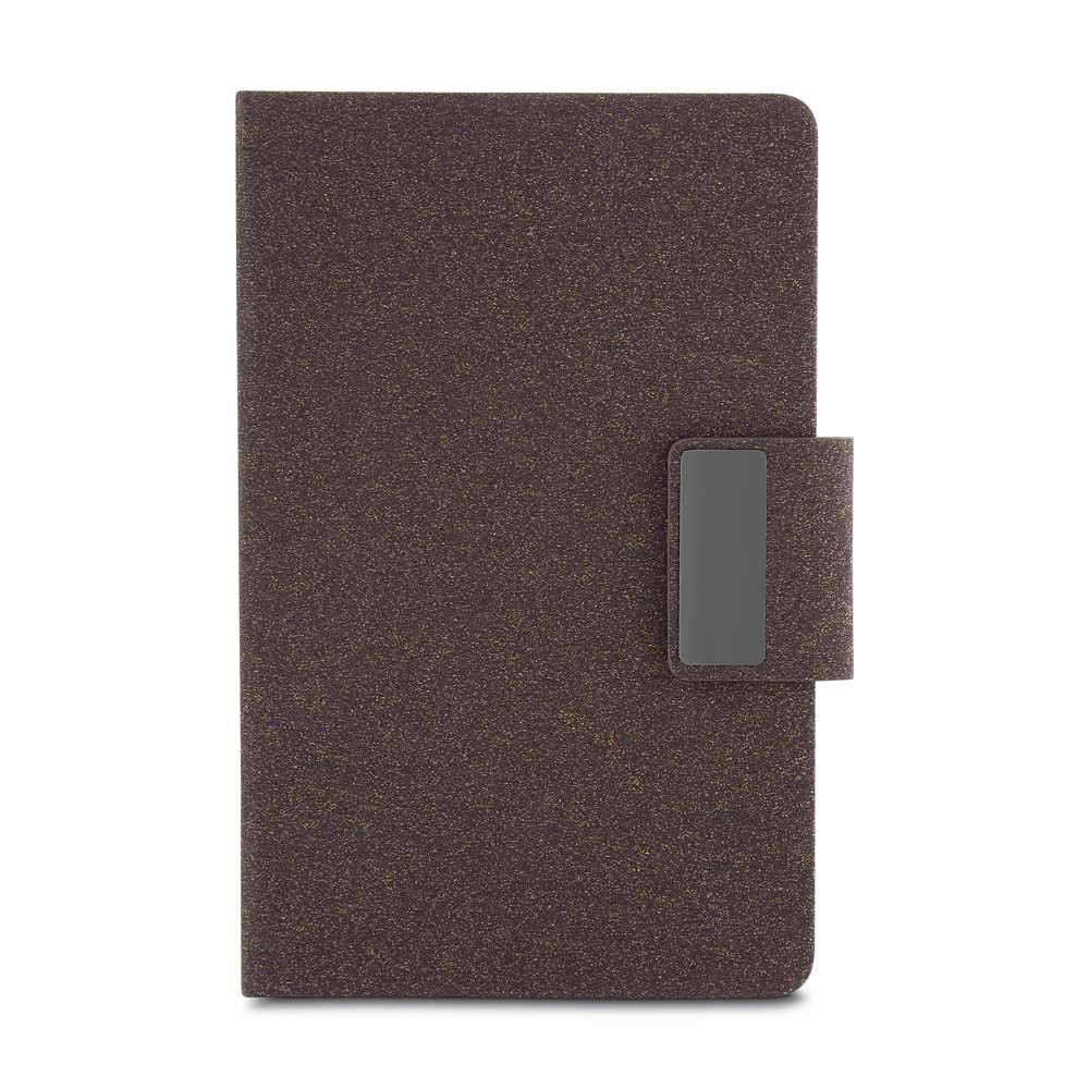 Caderno de anotações com capa em PU e fibra de chá ou café, 80 folhas 70 g/m², engate para caneta com fechamento magnético e placa de metal,não acompanha caneta.