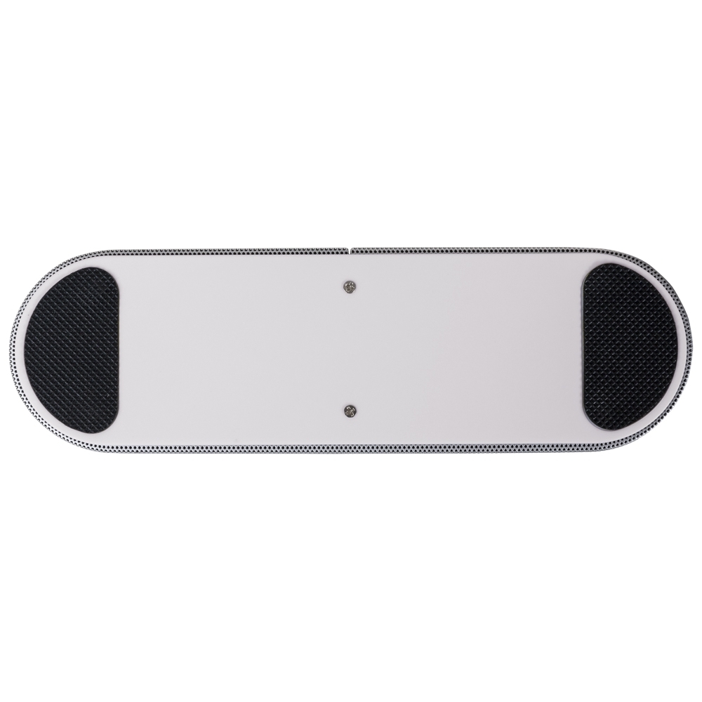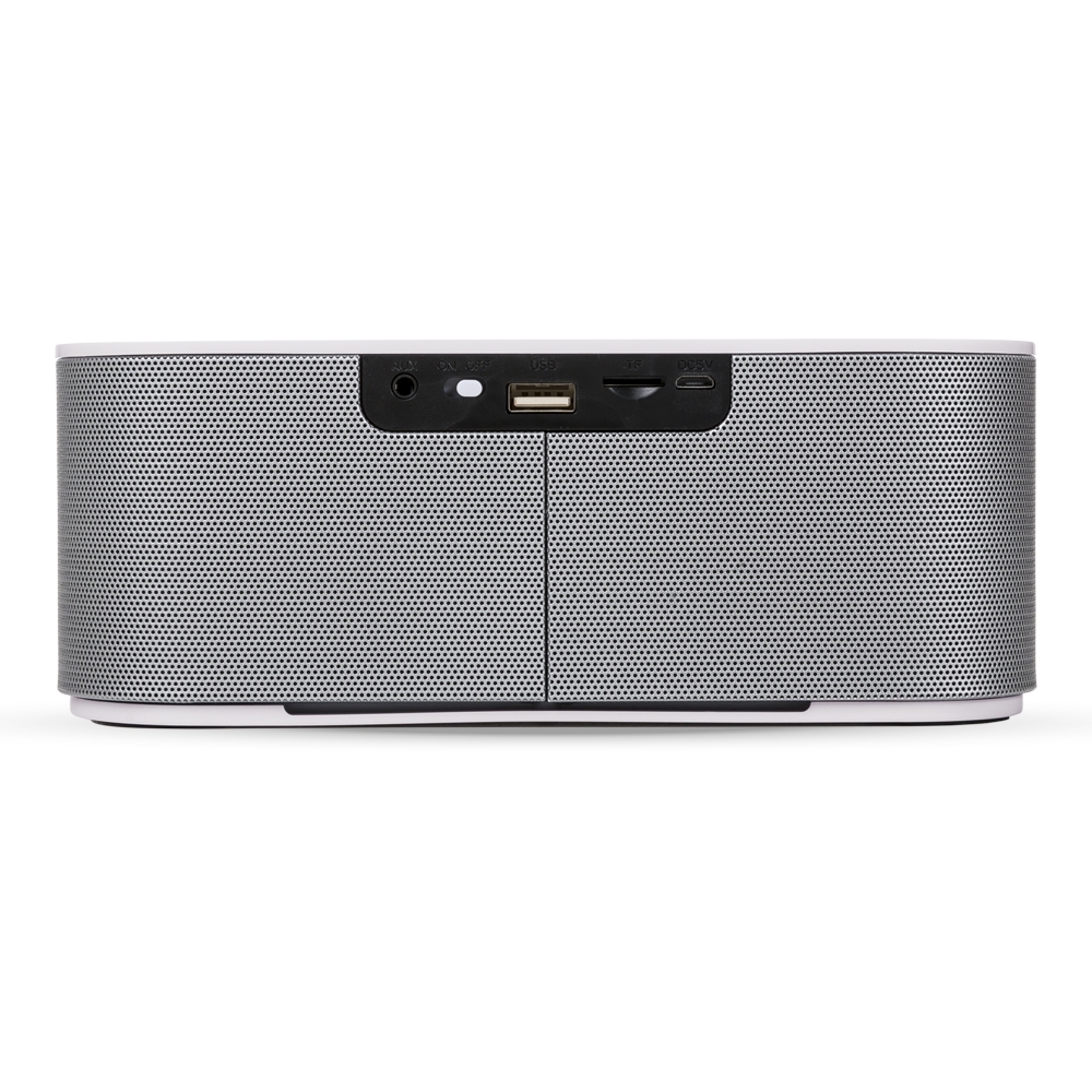 Caixa de som multimídia com estrutura feita em plástico, revestimento metálico e detalhes em material antideslizante na base. Possui conexão Bluetooth e rádio FM, além de painel de botões para controlar a reprodução de músicas a partir de aparelhos pareados, pen drives ou cartões microSD, por meio das entradas USB-A e TF. Conta ainda com entrada auxiliar P2 e acompanha cabo micro-USB para carregamento do aparelho.