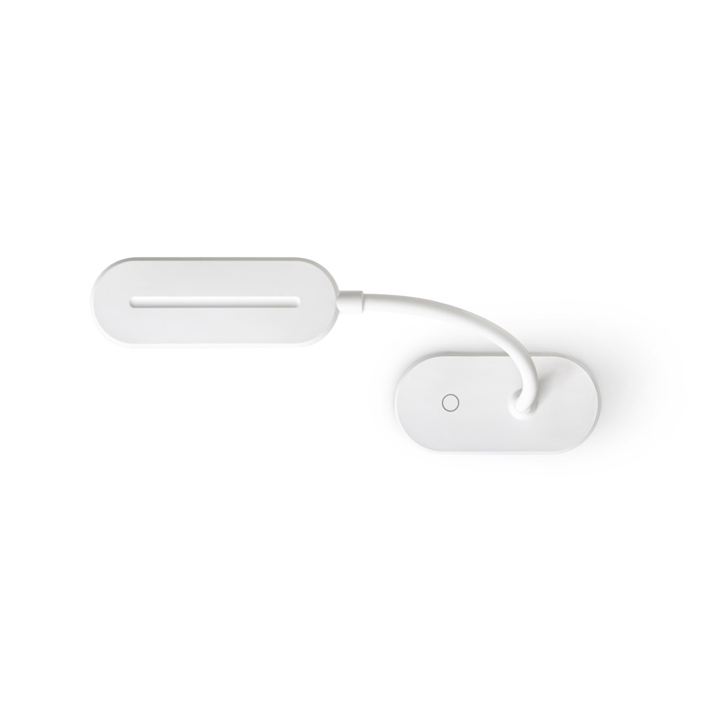 Luminária de mesa portátil em ABS 65% reciclado com 140 lumen e clip para segurar às superfícies. A base é antiderrapante e o tubo é maleável em 360º que permite ajustar com facilidade a direção da luz. Tem uma bateria incorporada de lítio de 1200 mAh. Contém um interruptor para ligar e desligar com 3 níveis de luminosidade: Luz alta (aproximadamente 3 h de utilização), luz média (aproximadamente 7 h de utilização) e luz baixa (aproximadamente 30 h de utilização). Incluso um cabo de carregamento USB-C. Fornecida em caixa presente de papel kraft reciclado