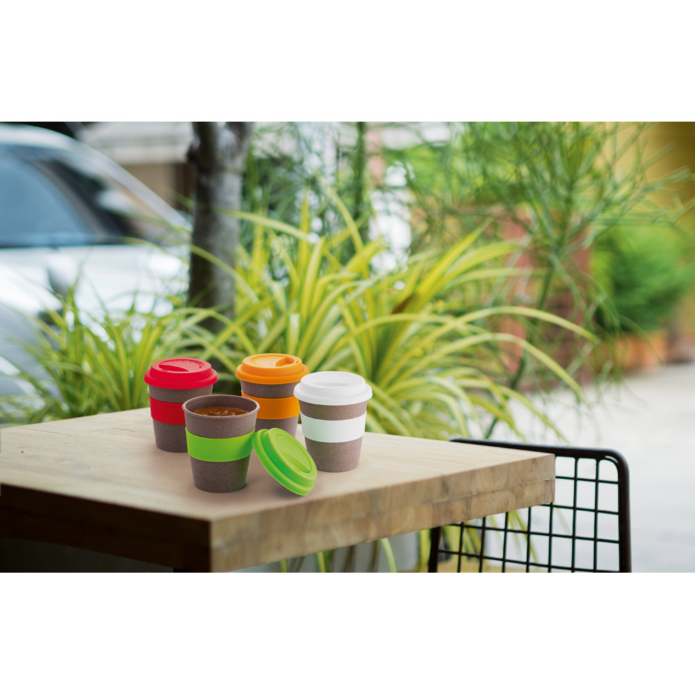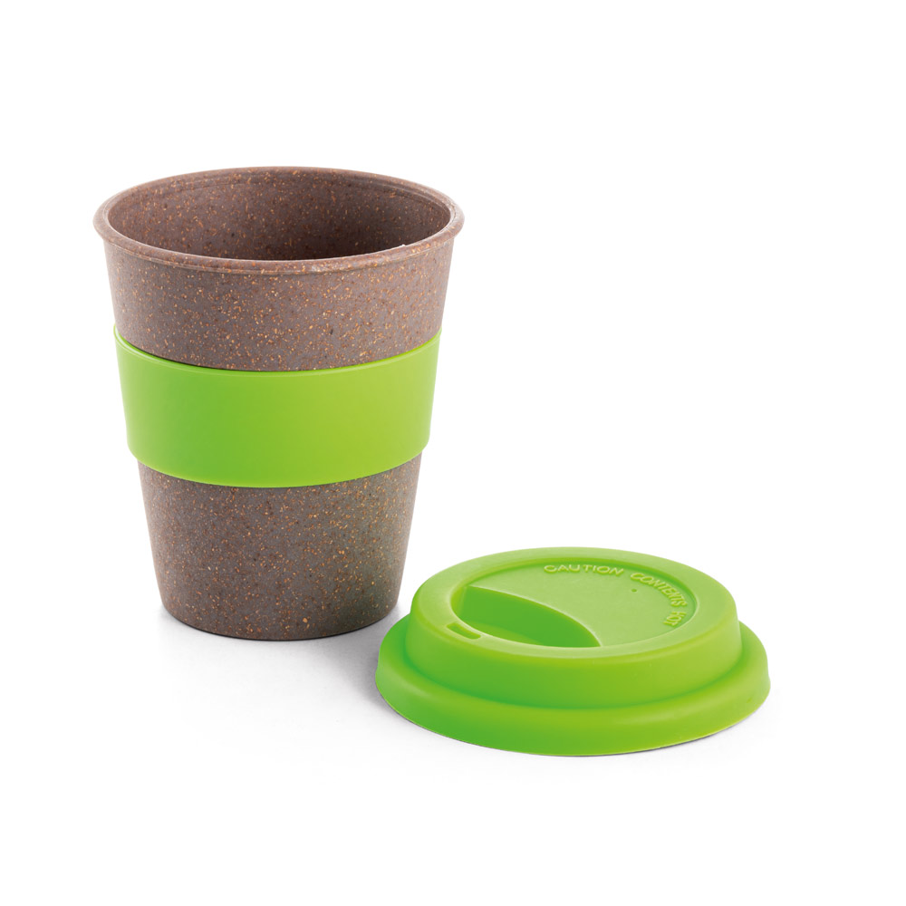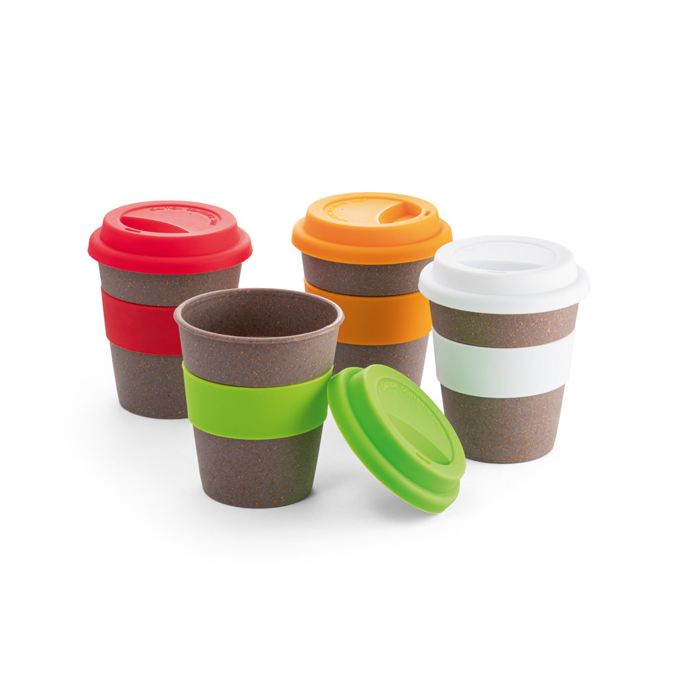 Copo de viagem em fibra de bambu e PP com tampa e tira em silicone. Capacidade até 390 mL. Certificação EU Food Grade. Retirar tampa antes de colocar no micro-ondas. Ø95 x 113 mm