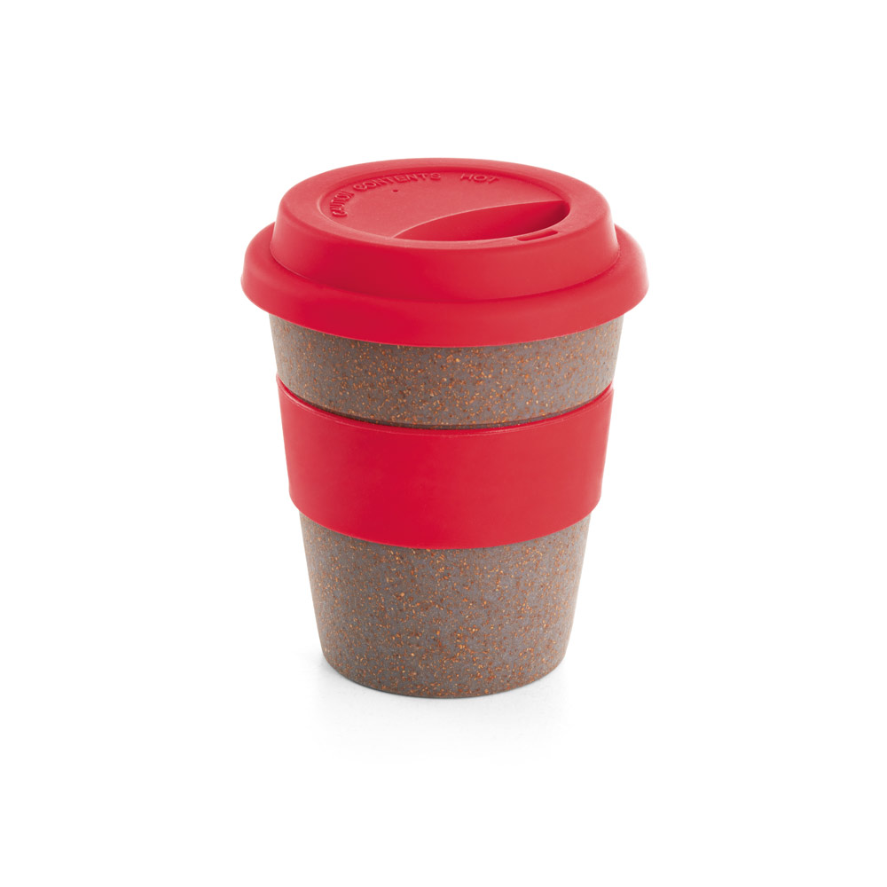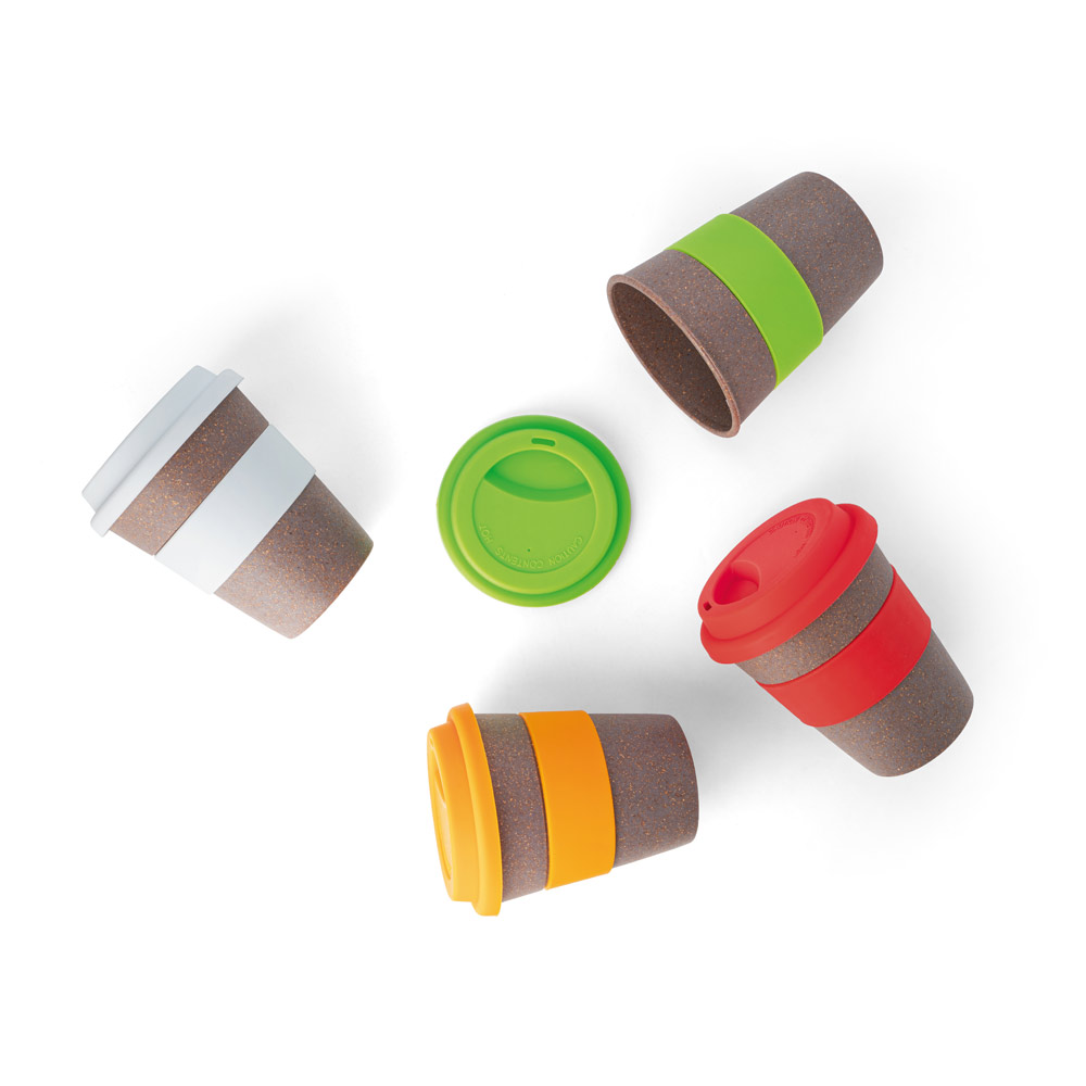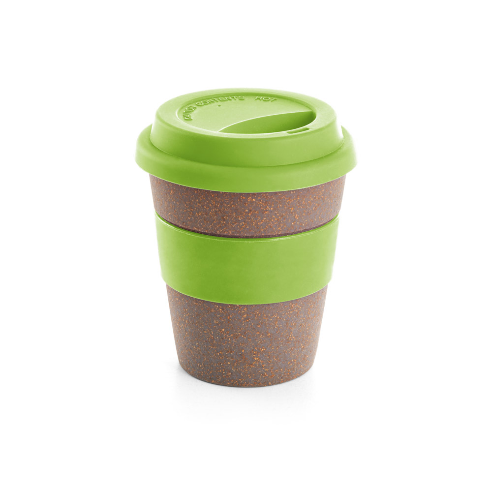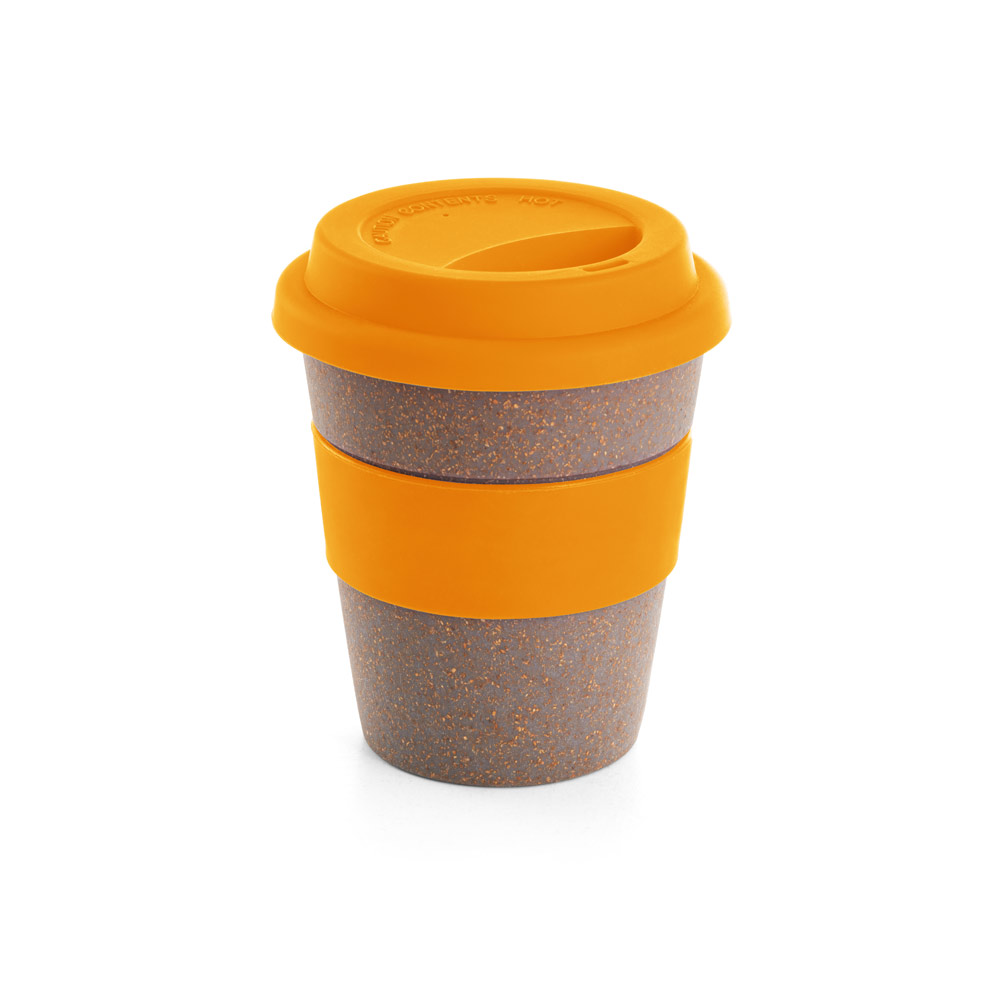 Copo de viagem em fibra de bambu e PP com tampa e tira em silicone. Capacidade até 390 mL. Certificação EU Food Grade. Retirar tampa antes de colocar no micro-ondas. Ø95 x 113 mm