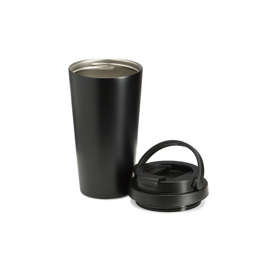 Copo térmico em inox, com capacidade para 485ml. Contém base antiderrapante, tampa plástica rosqueável com alça, abertura para bocal e trava de segurança.