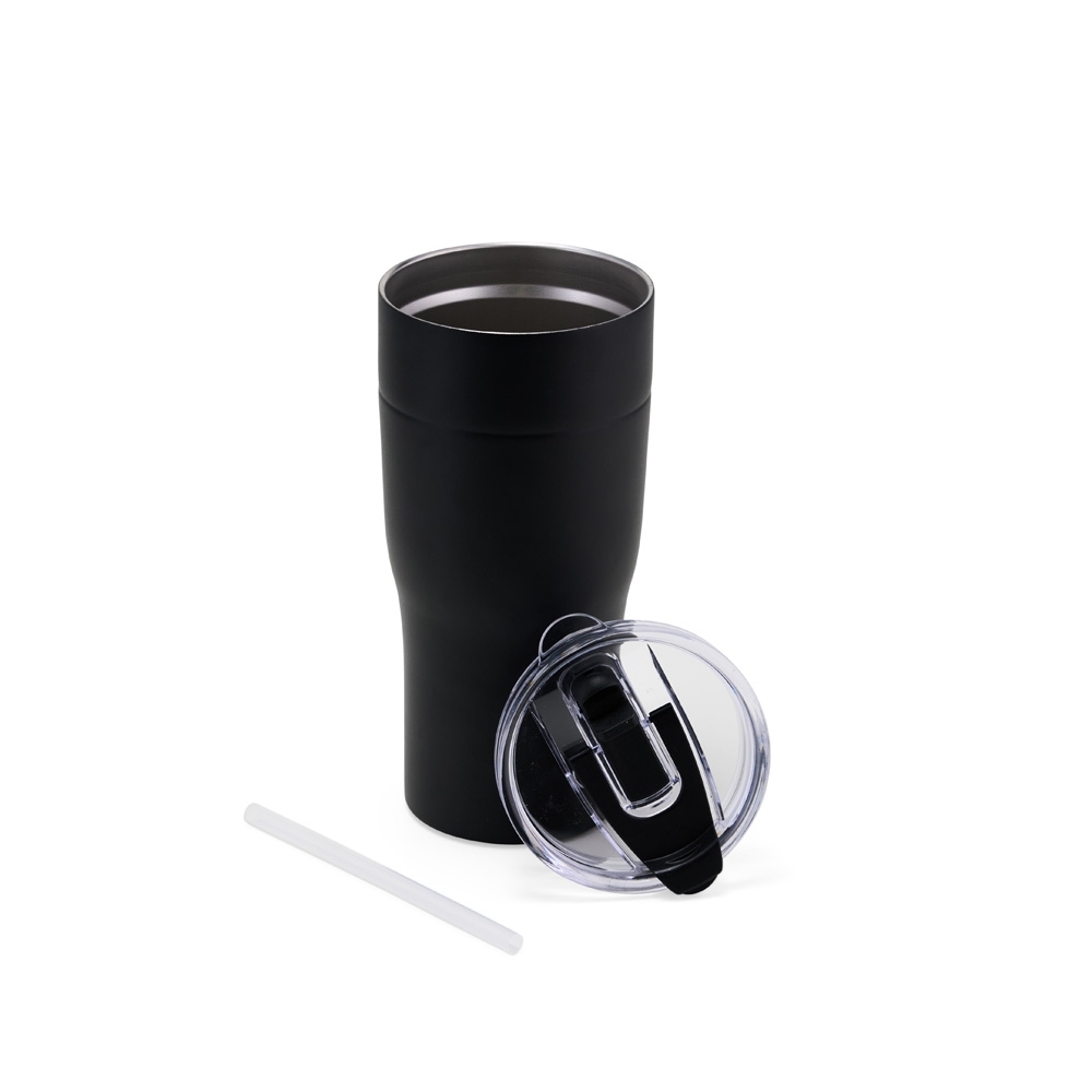 Copo térmico feito em Inox 304 com parede dupla e capacidade de 820ml. Sua tampa é rosqueável e contém trava de segurança e canudo flip. Sua base é antiderrapante e acompanha canudo plástico.