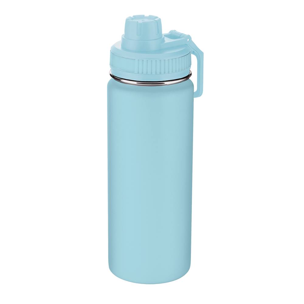 Garrafa térmica em aço inox com parede dupla isolada a vácuo e com capacidade de 570 ml. Tampa rosqueável com anel de silicone, alça plástica em formato de mosquetão e bico rosqueável para fácil acesso. Design com frisos na tampa e pintura a pó.