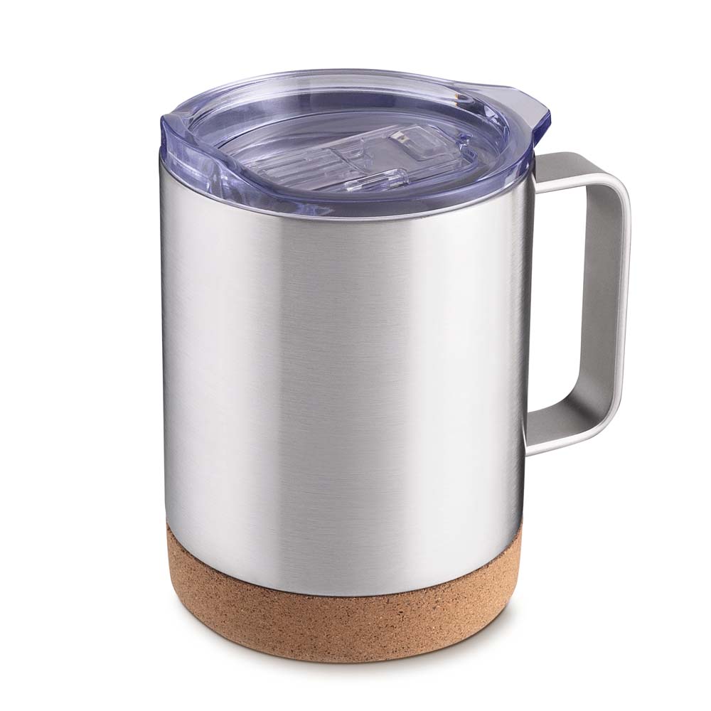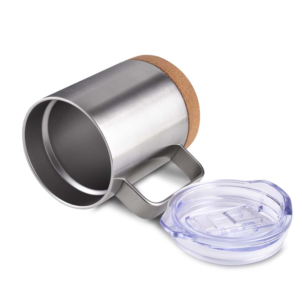 Caneca térmica em aço inox brilhoso com capacidade 350ml. Parede dupla isolada à vácuo, tampa plástica com anel em silicone para vedação, alça lateral em inox na cor do produto com base em cortiça.