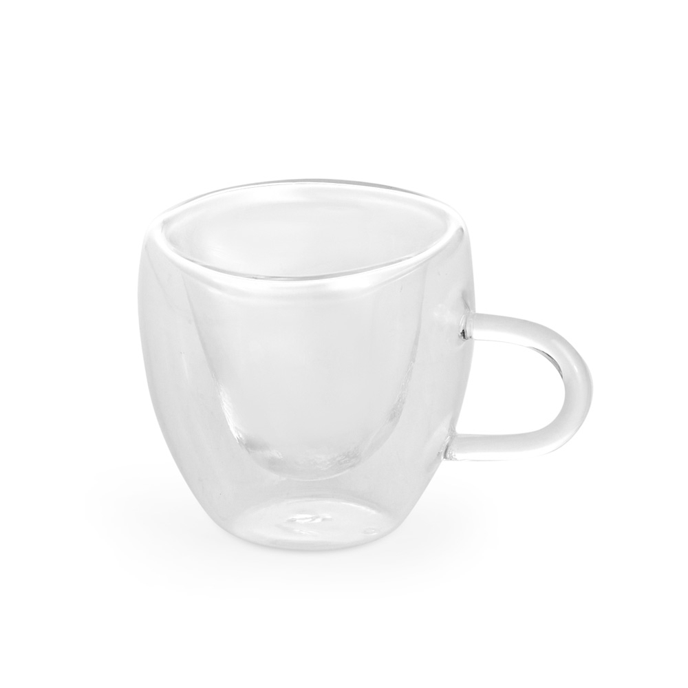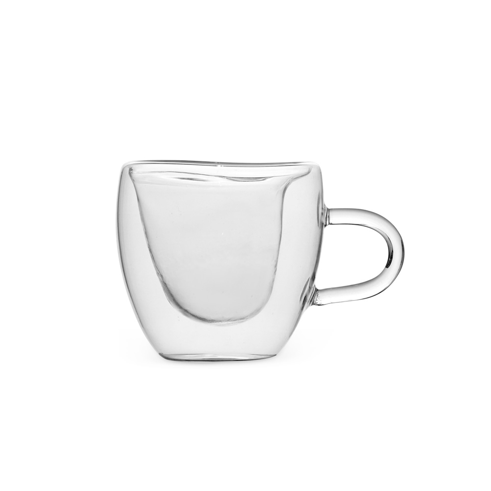 Xícara de vidro com capacidade para até 80ml. Possui contorno interno em formato de coração e estrutura de parede dupla que ajuda a impedir que a temperatura de líquidos entre em contato com a parte externa.