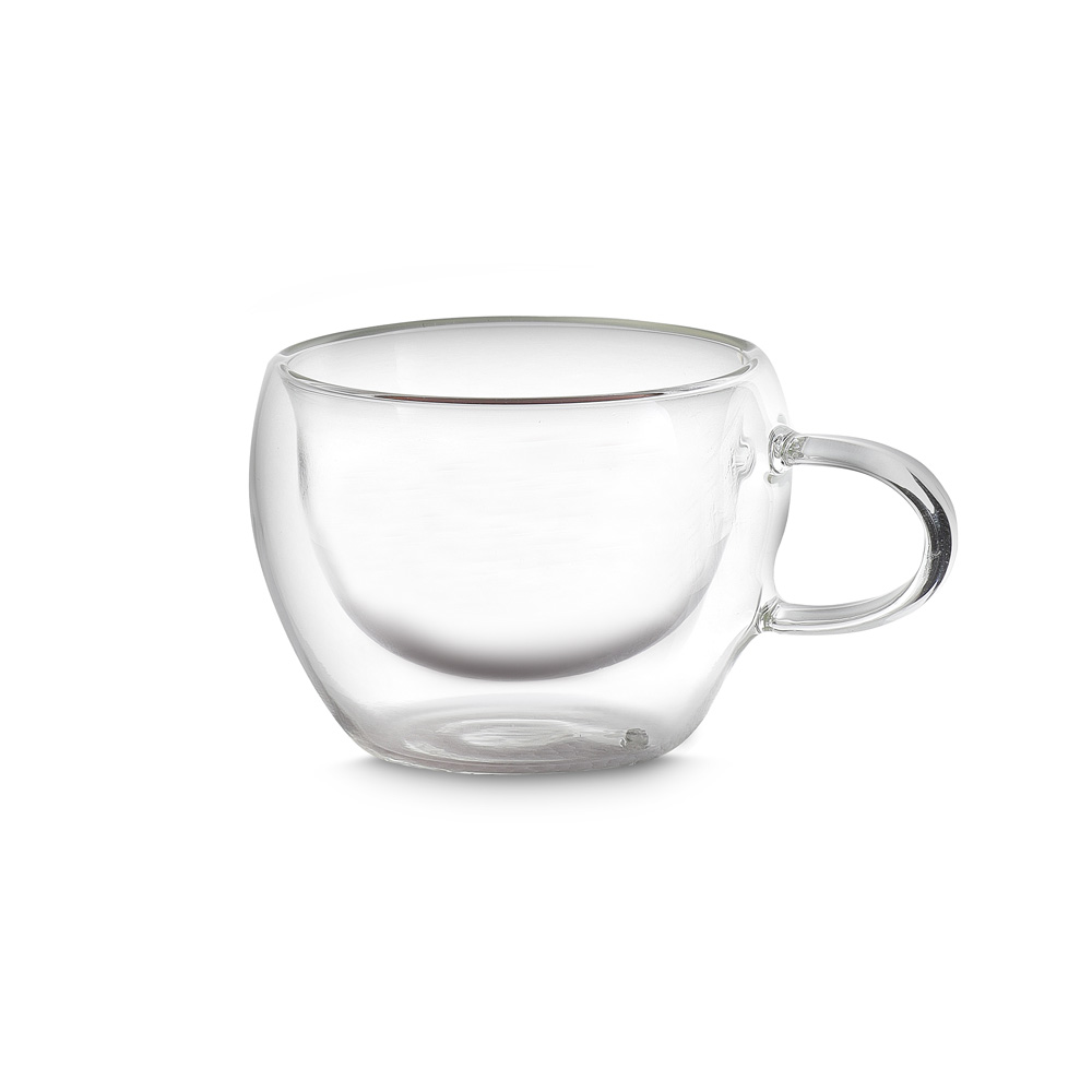 Conjunto com 2 xícaras de vidro borossilicato com parede dupla e capacidade de até 60ml.