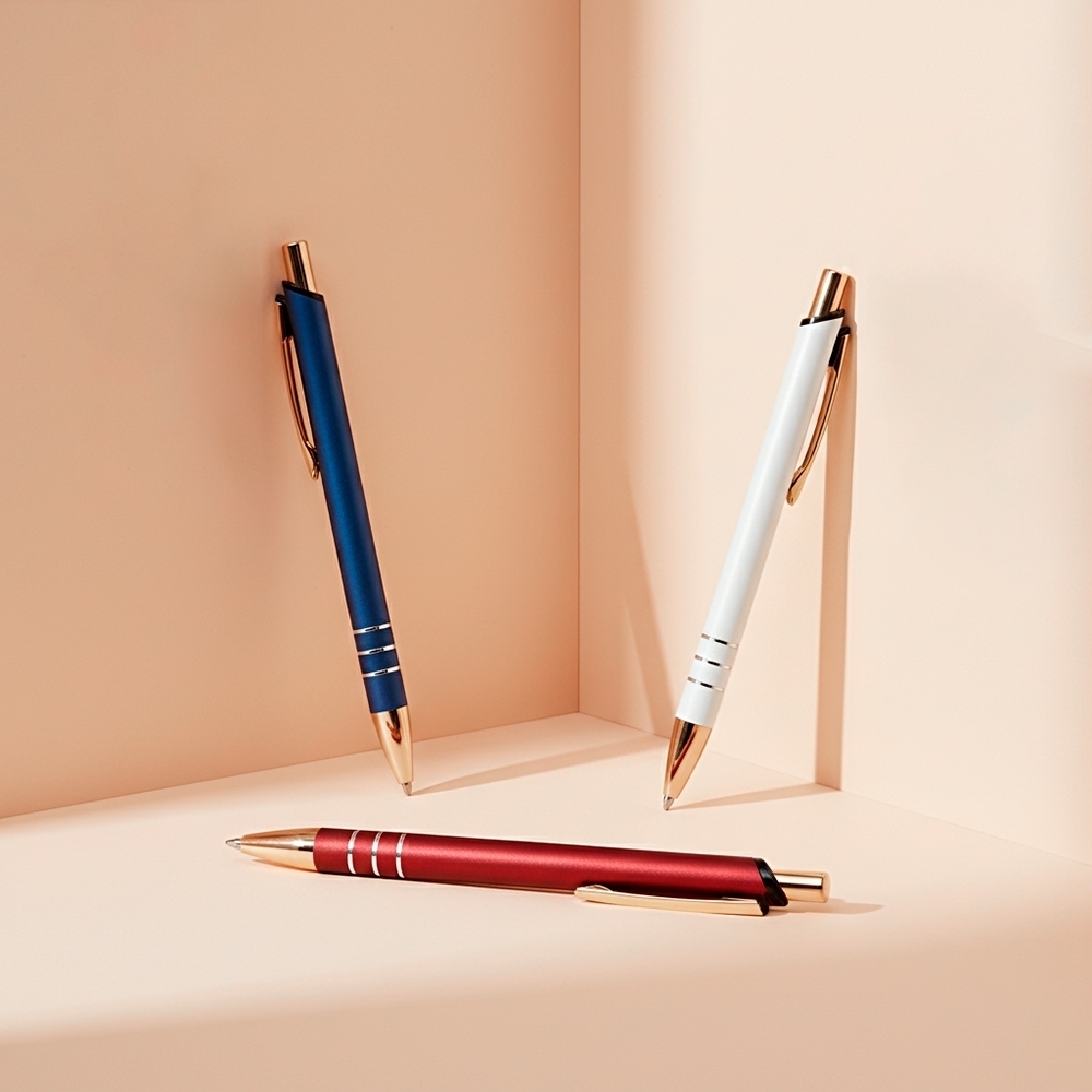 Caneta metálica com acionamento por clique e carga esferográfica azul de 1,0mm, oferecendo uma pegada leve para uma escrita mais precisa.