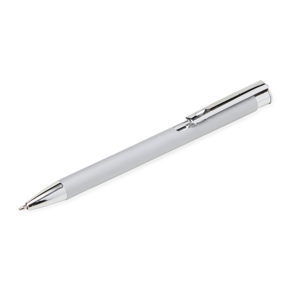 Caneta metálica com carga esferográfica azul 1.0mm e acionamento por clique.