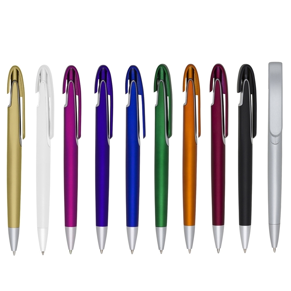 Caneta plástica com carga esferográfica azul 1.0 mm e acionamento por clique.