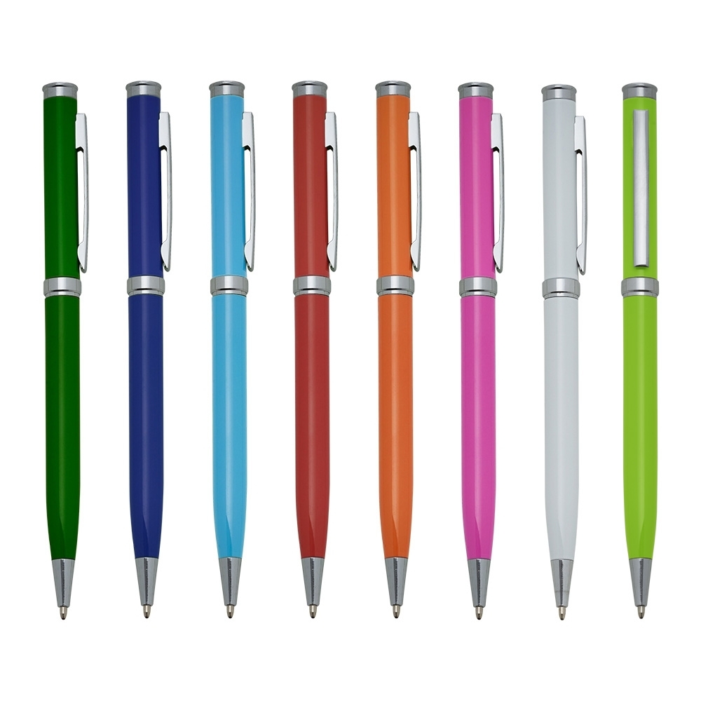 Caneta metálica com carga esferográfica azul 1.0 mm e acionamento por rotação.
