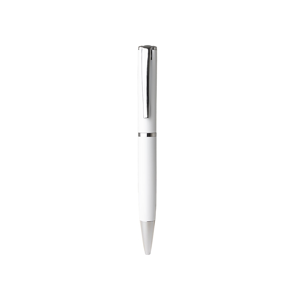 Caneta metálica com carga esferográfica azul 1.0mm e acionamento por rotação.