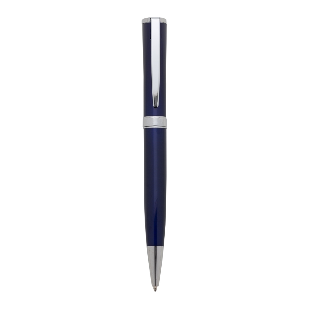 Caneta metálica com carga esferográfica azul 1.0 mm e acionamento por rotação.
